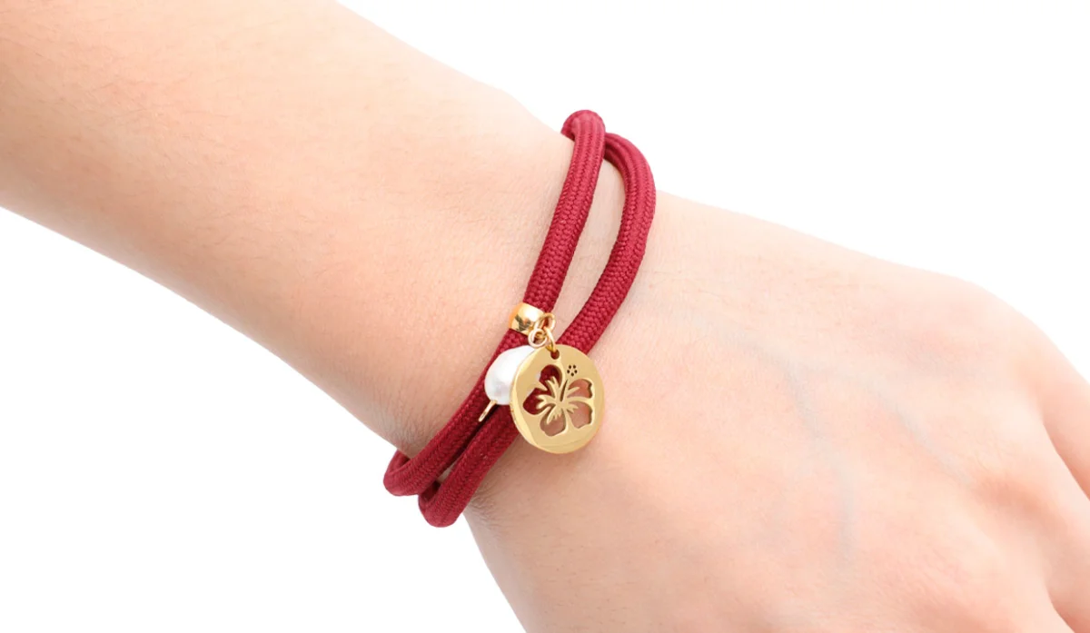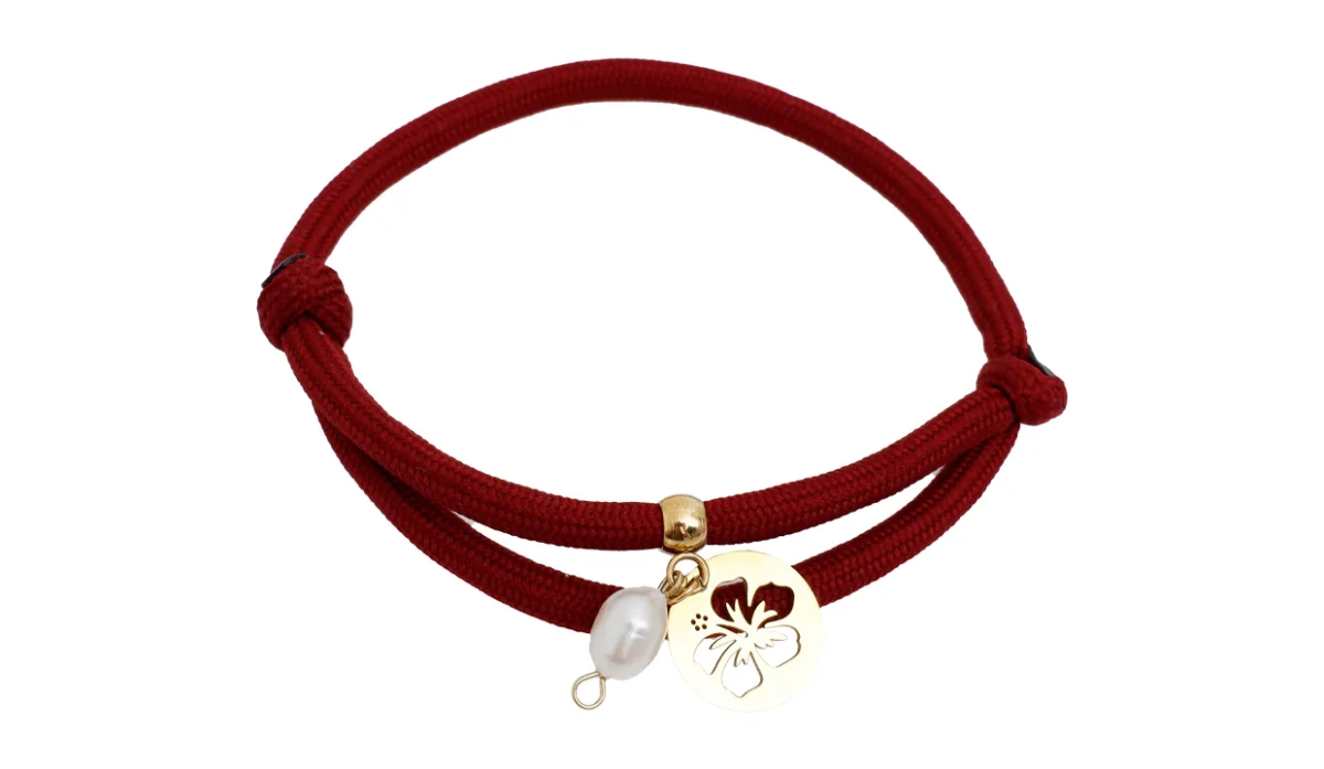 - Cordón trenzado de poliéster, dijes (latón con baño de oro, acero y perla nácar).