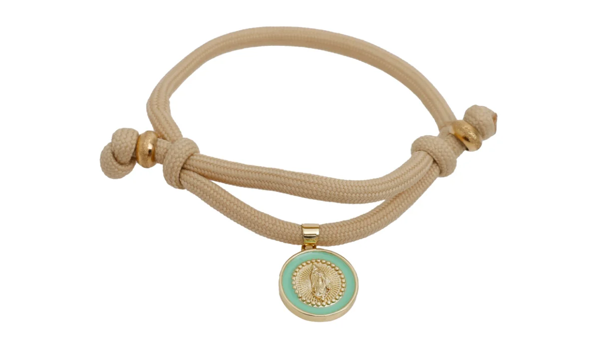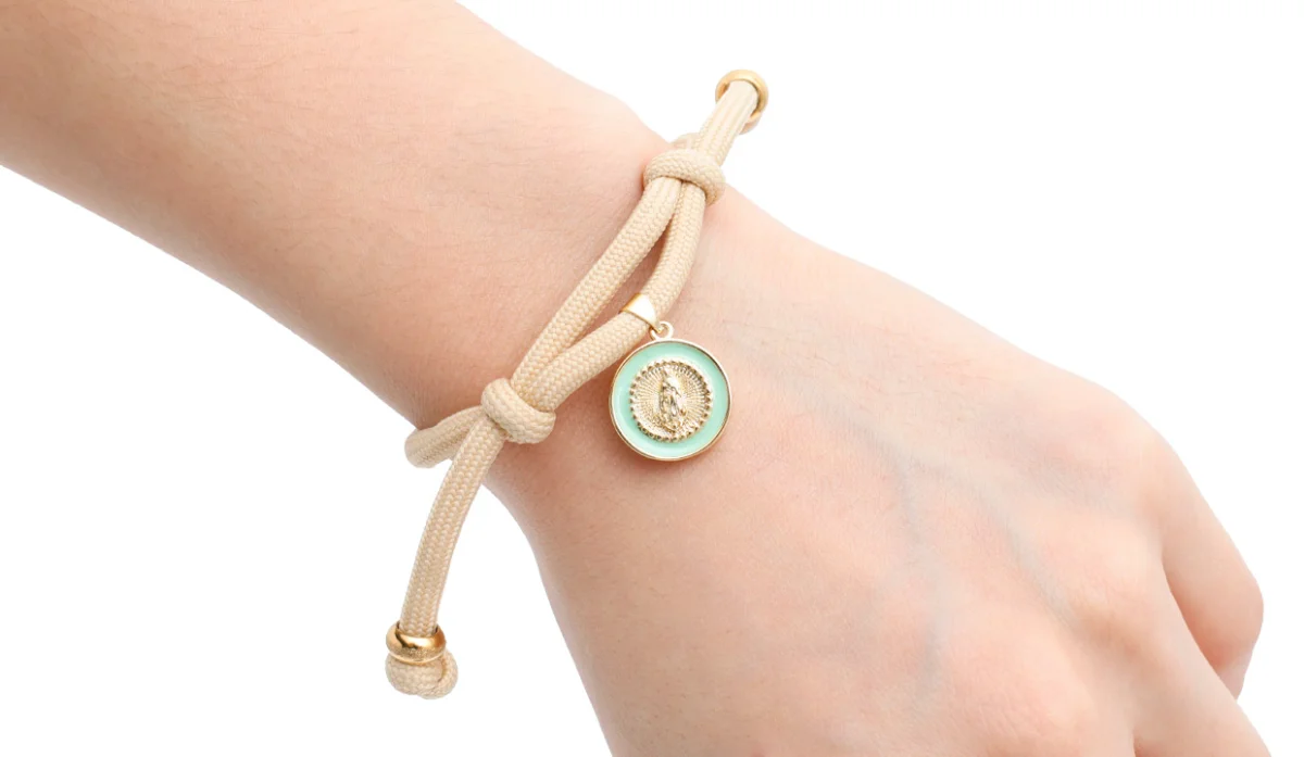 - Cordón trenzado de poliéster, dijes (latón con baño de oro, acero y perla nácar).