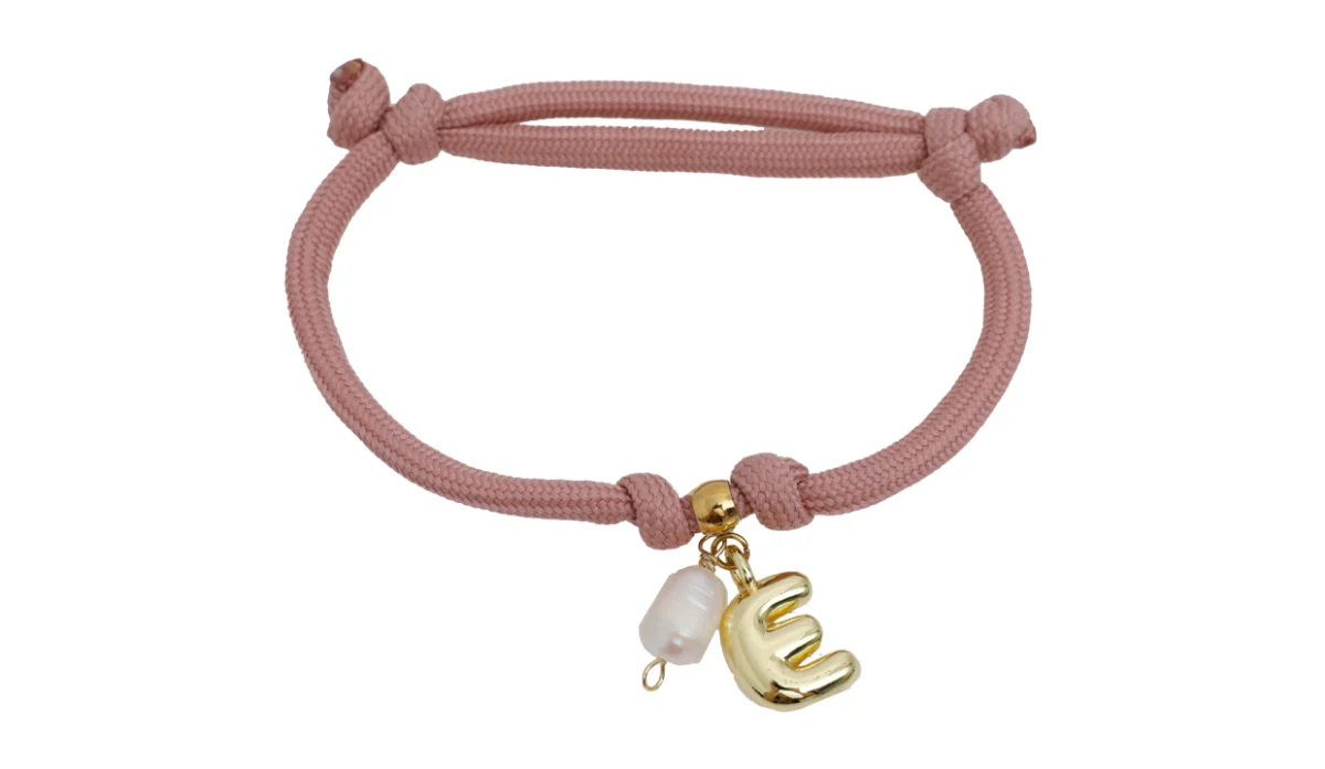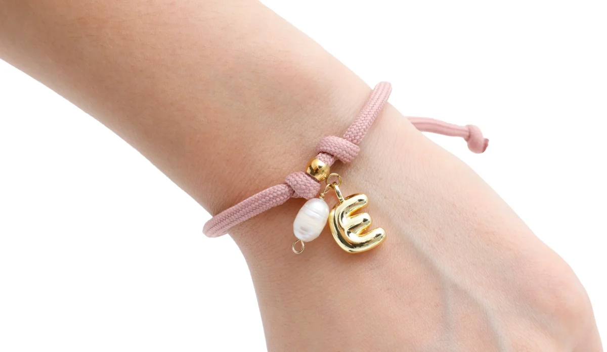 - Cordón trenzado de poliéster, dijes (latón con baño de oro, acero y perla nácar).