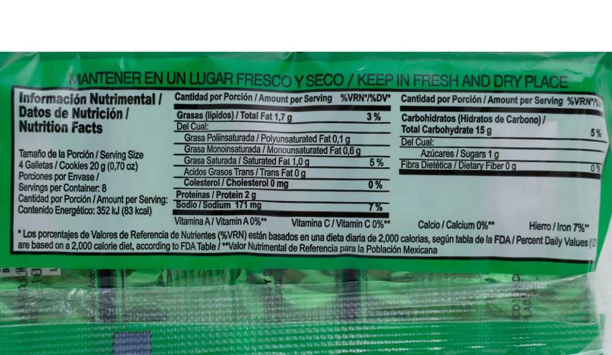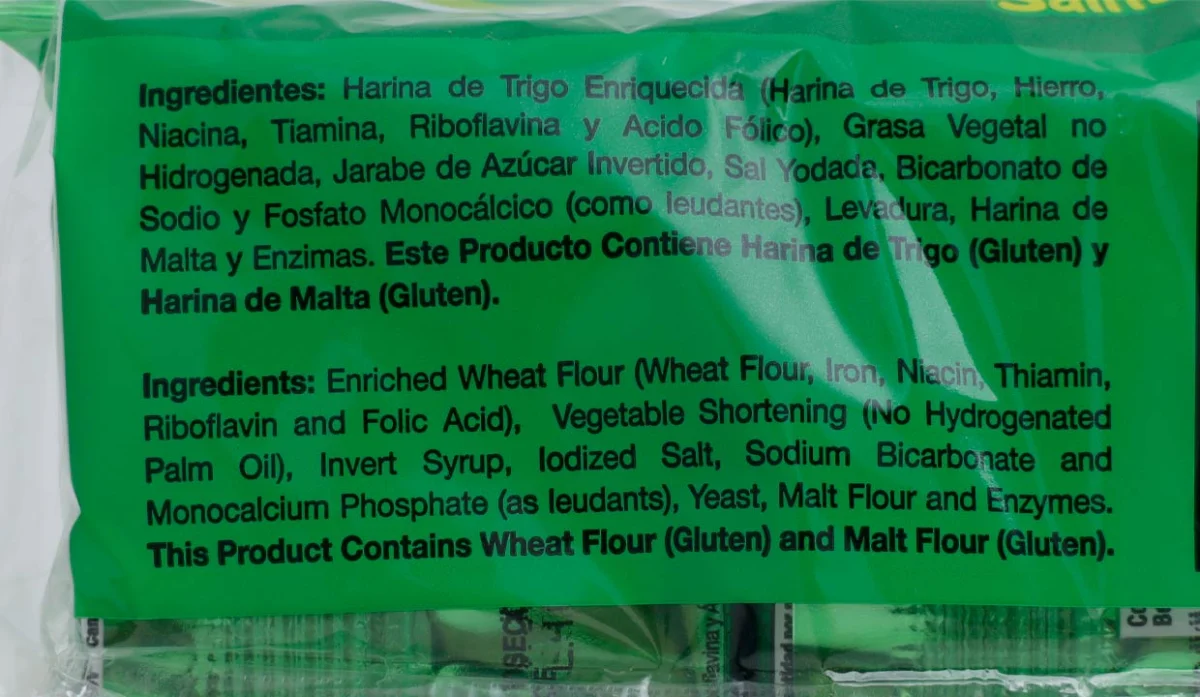 - Harina de trigo enriquecida (harina de trigo, hierro, niacina, tiamina, riboflavina y ácido fólico), grasa vegetal no hidrogenada, jarabe de azúcar invertido, sal yodada, bicarbonato de sodio y fosfato monoacálcico (como leudantes), levadura, harina de malta y enzimas.