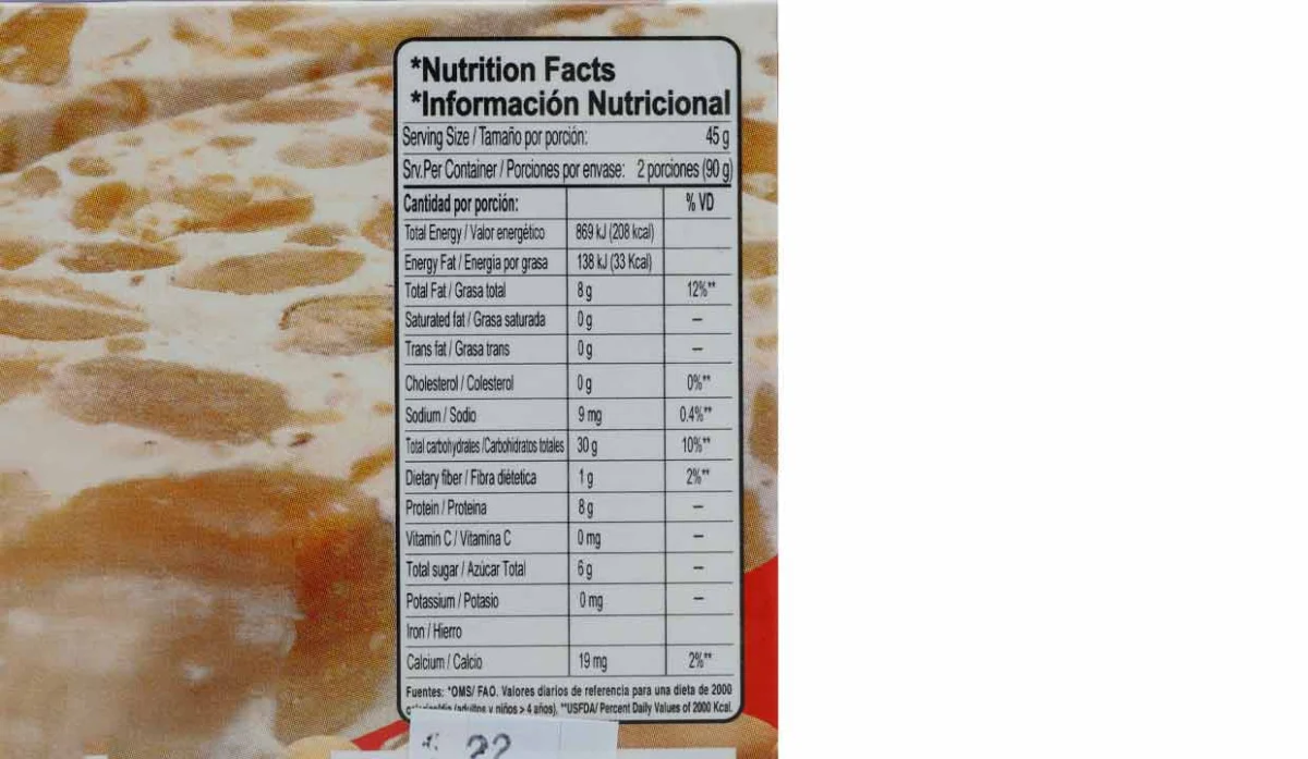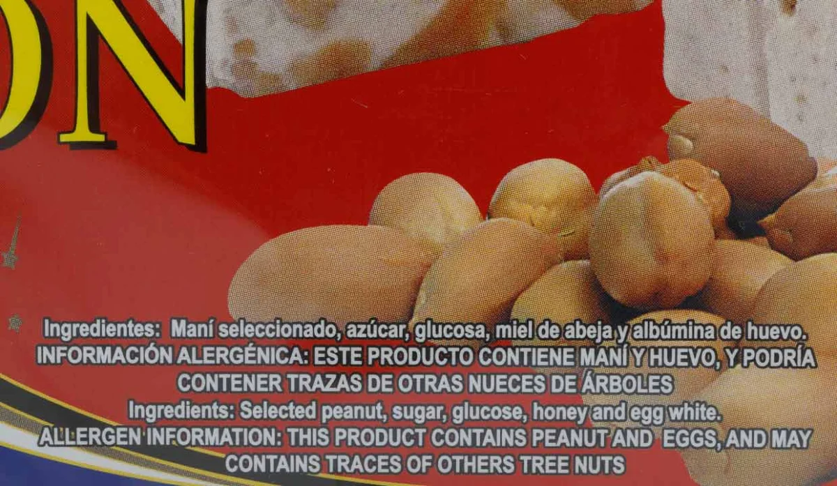 - Maní seleccionado, azúcar, glucosa, miel de abeja y albúmina de huevo.