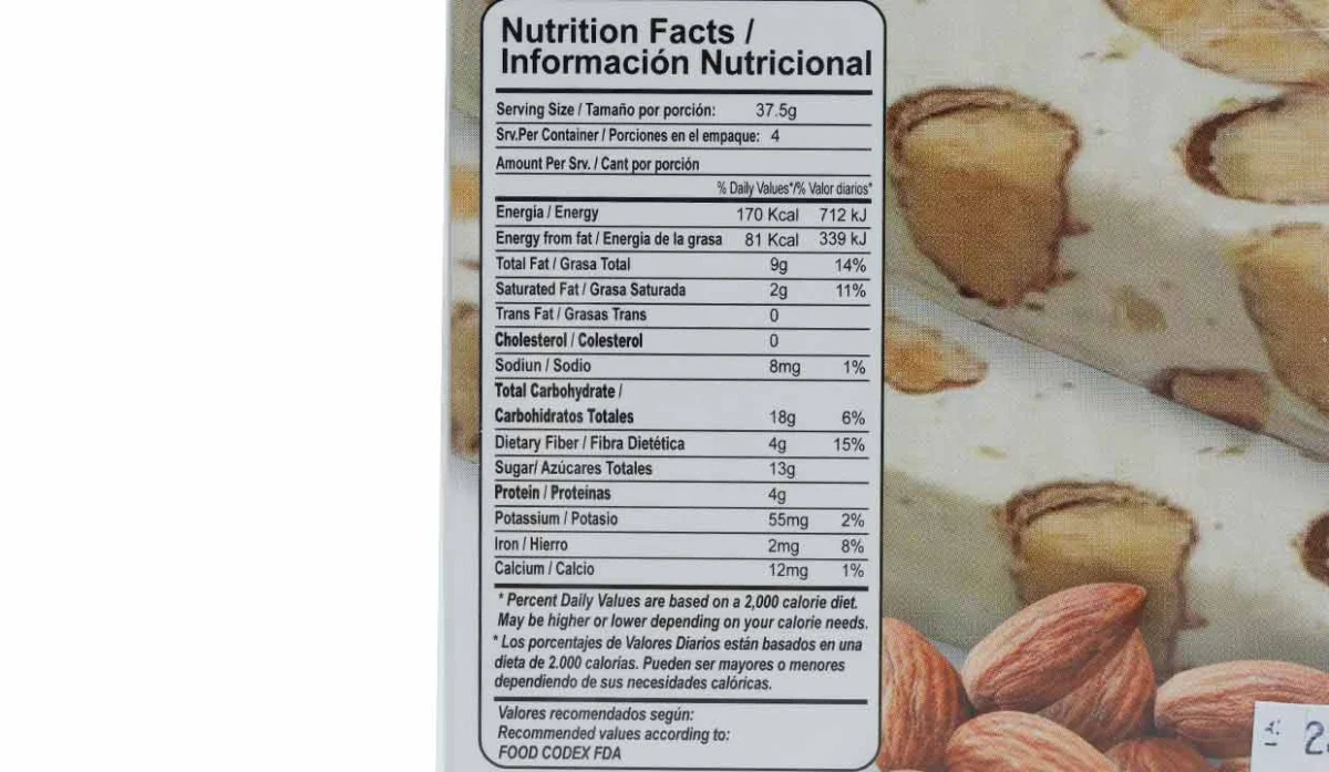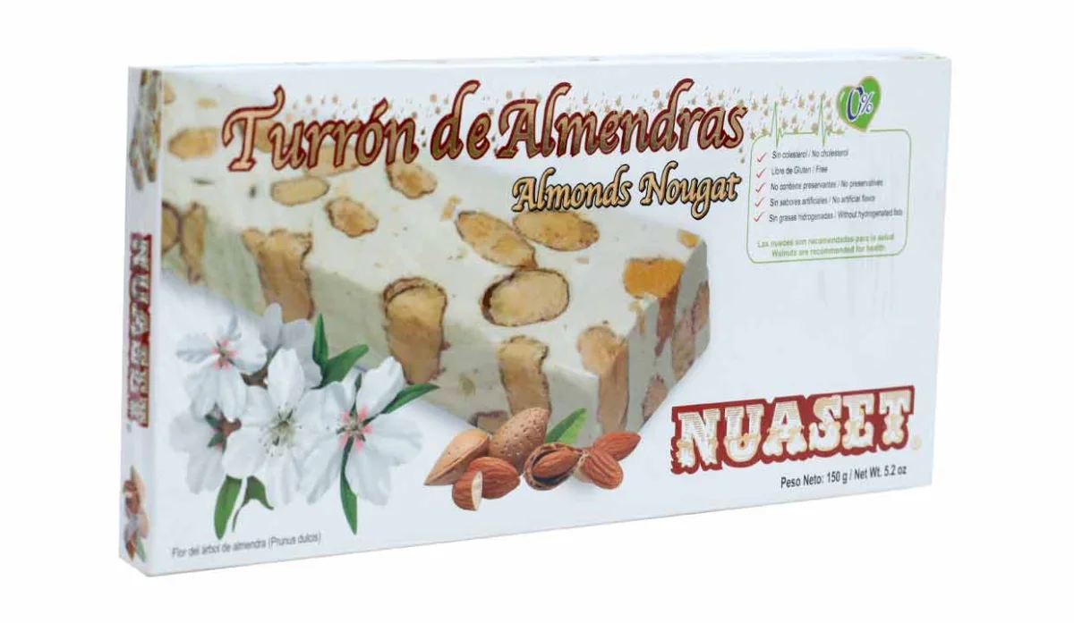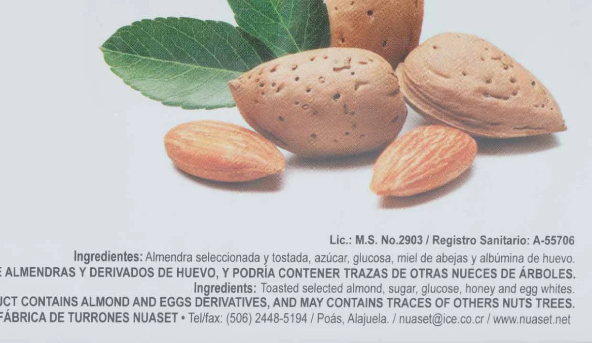 - Almendra seleccionada y tostada, azúcar, glucosa, miel de abejas y albúmina de huevo.