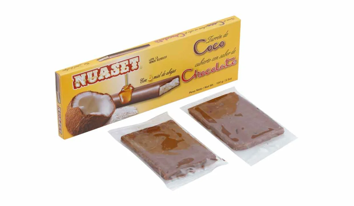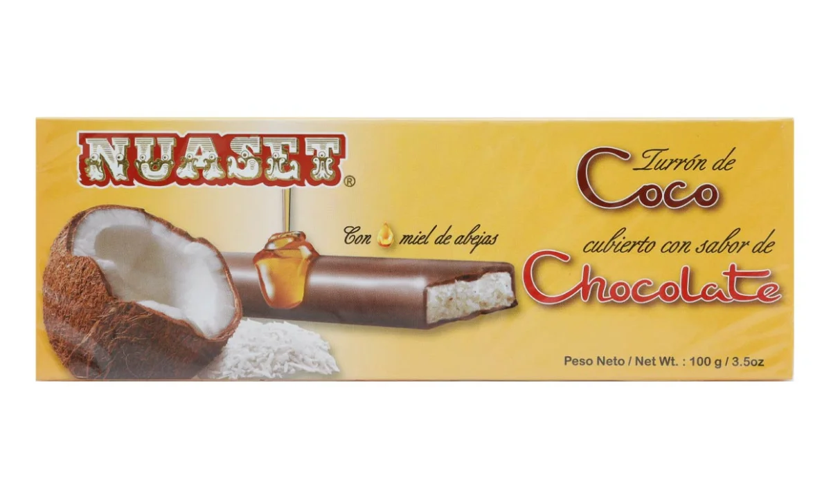 - Turrón de coco cubierto con saber a chocolate y miel de abejas.