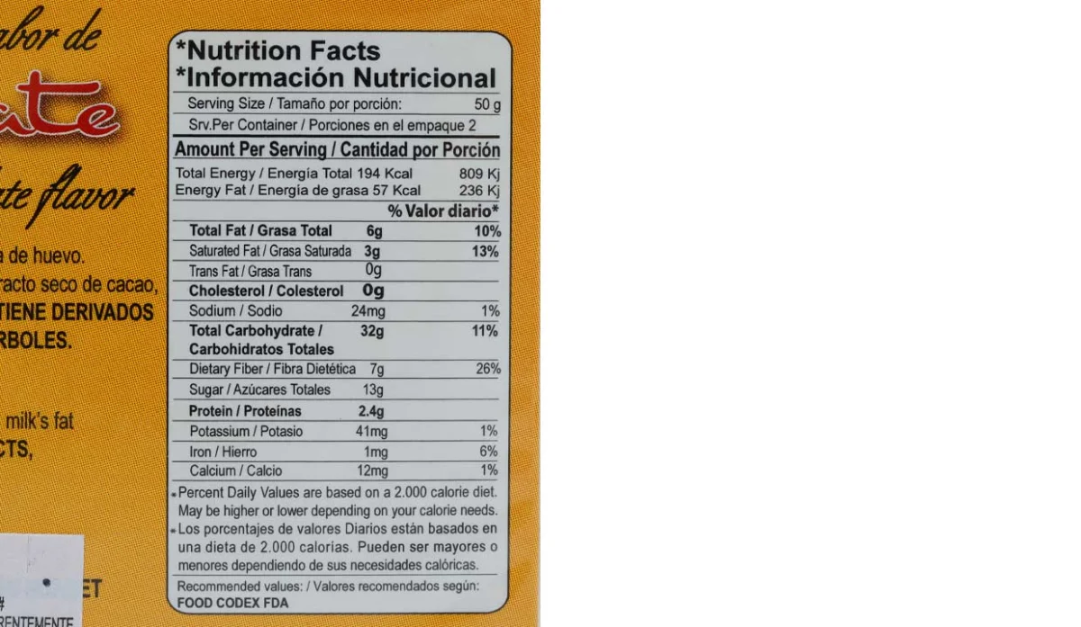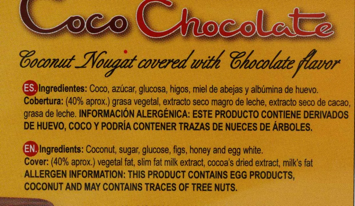- Coco, azúcar, glucosa, higos, miel de abejas y albúmina de huevo, cobertura (40% aproximadamente), grasa vegetal, extracto de magro de leche, extracto seco de cacao, grasa de leche.