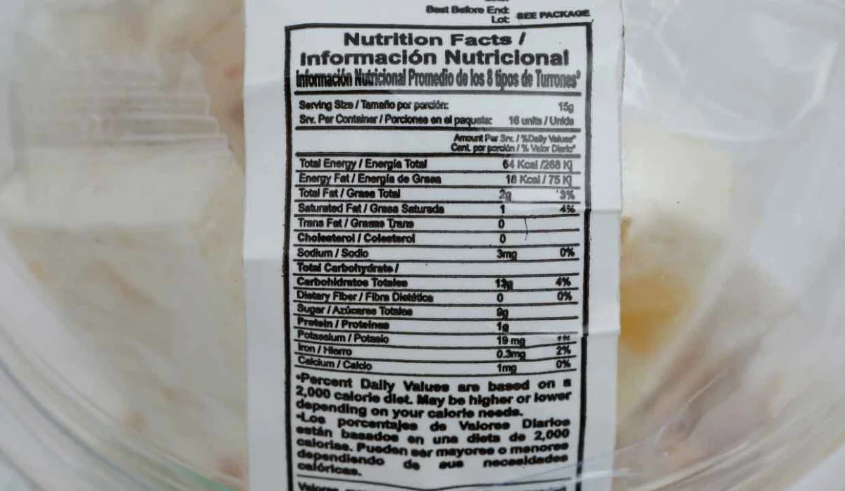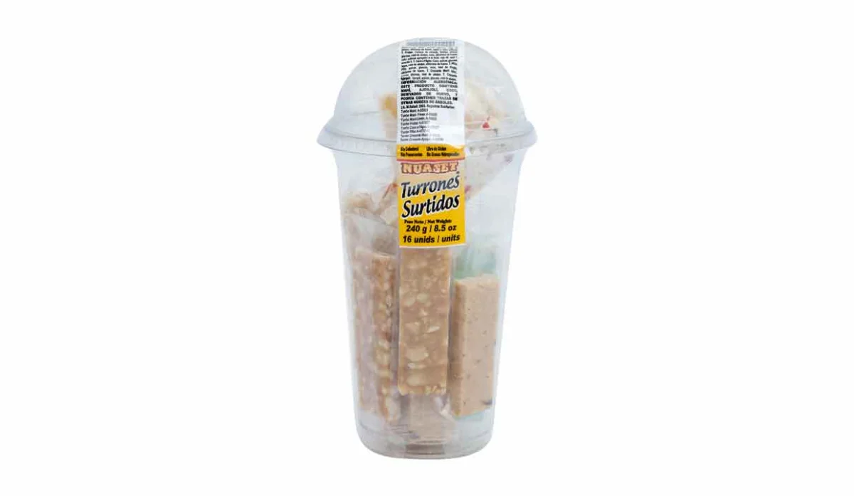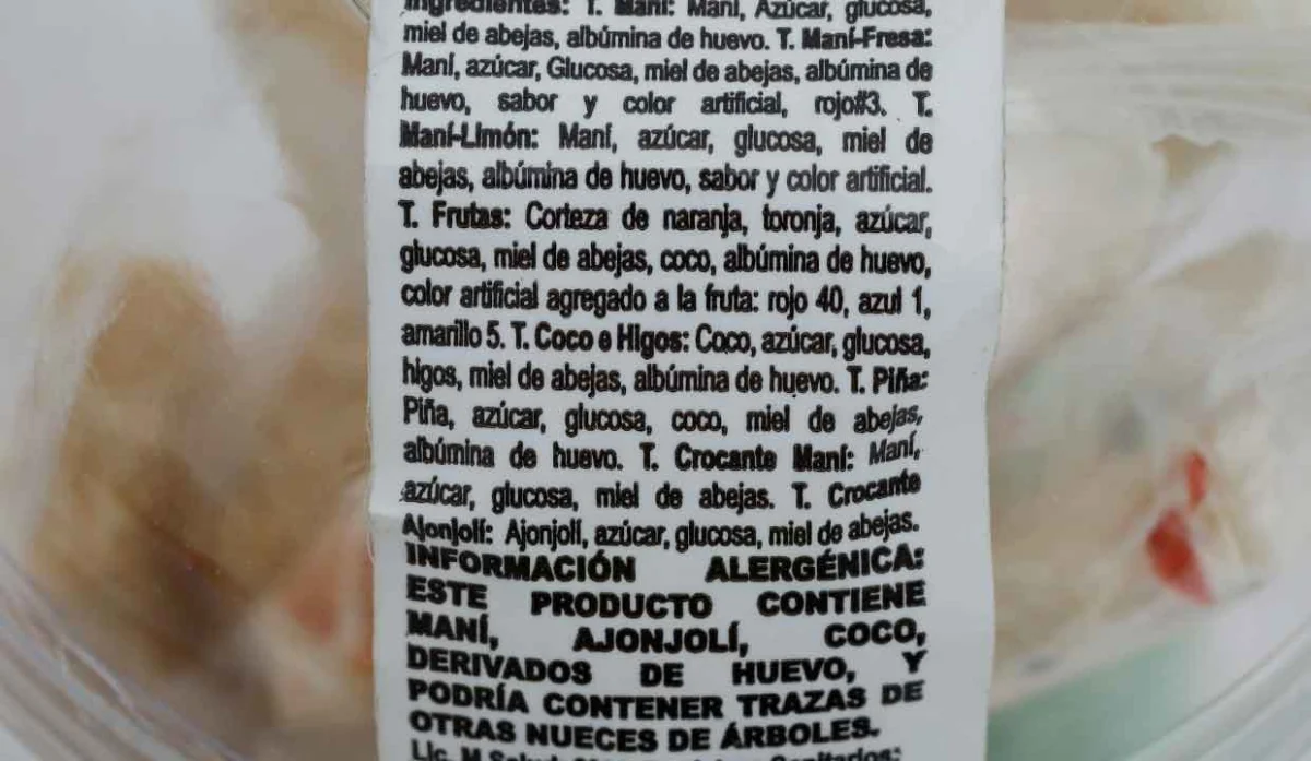 - Maní, azúcar, glucosa, miel de abejas, albúmina de huevo, sabor y color artificial rojo #3, corteza de naranja y toronja, color artificial agregado a la fruta, rojo 40, azul 1, amarillo 5, coco, higos, piña y ajonjolí.