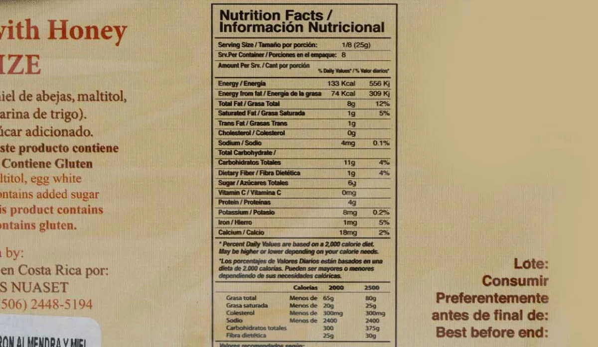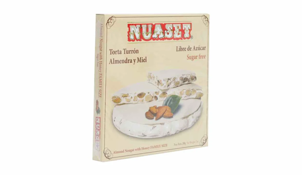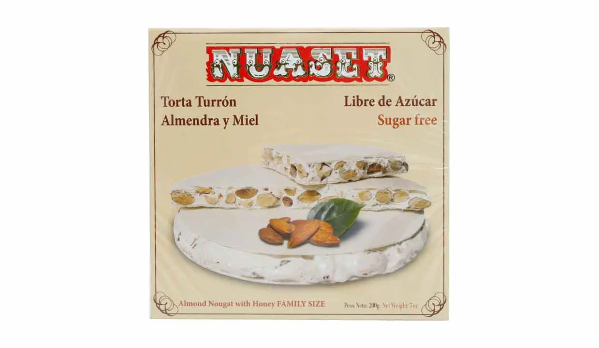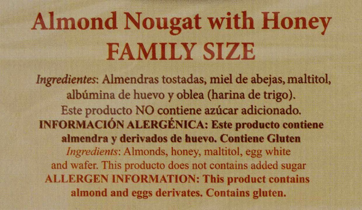 - Almendras tostadas, miel de abejas, maltitol, albúmina de huevo y oblea (harina de trigo).