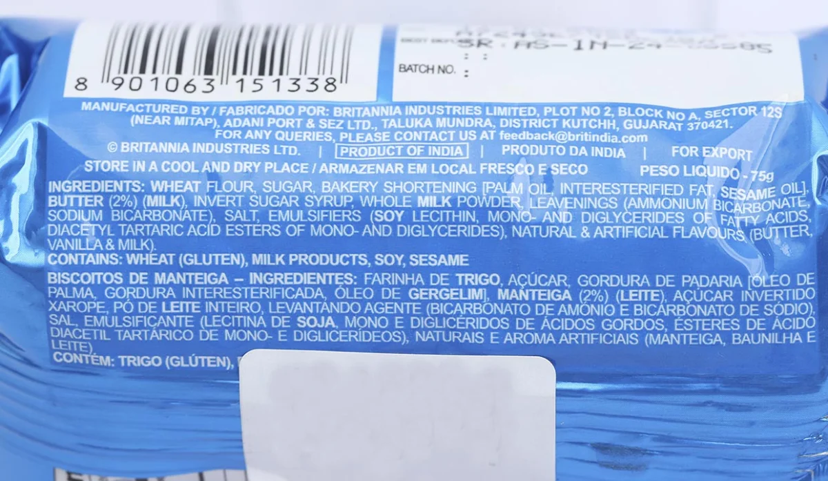 - Harina de trigo, azúcar, manteca vegetal, aceite de palma, grasa interesterificada, aceite de sésamo, mantequilla 2%, leche, jarabe de azúcar invertido, leche entera en polvo, leudantes, bicarbonato de amonio y sodio, sal, emulsionantes, lecitina de soja, mono y diglicéridos de ácidos grasos, diacetilo, ésteres de ácido tartárico de mono y diglicéridos, sabores naturales y artificiales de mantequilla, vainilla y leche.
