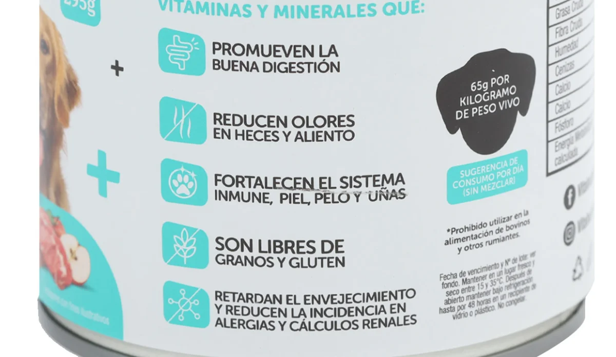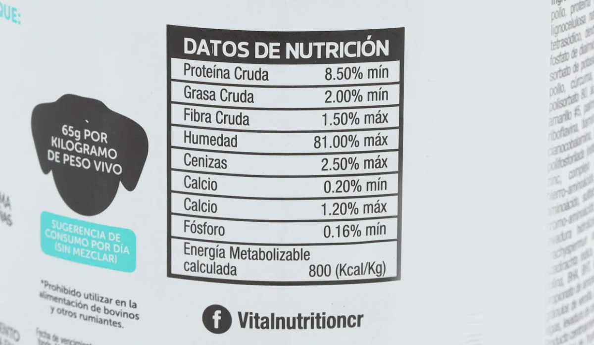 - Ácido cítrico, benzoato de sodio, sorbato de potasio, color amarillo #5, palmitato de vitamina A, colecalciferol, acetato de tocoferol, riboflavina, tiamina, piridoxina, bisulfito sódico de menadiona, biotina cianocobalamina, niacina, ácido fólico, pantotenato de calcio, vitamina C, polifosforilaba, sulfato de zinc, complejo zinc aminoácido, carbonato de hierro, complejo hierro aminoácido, sulfato manganeso, complejo de maganeso, aminoácido sulfato de cobre, complejo de cobre aminoácido.