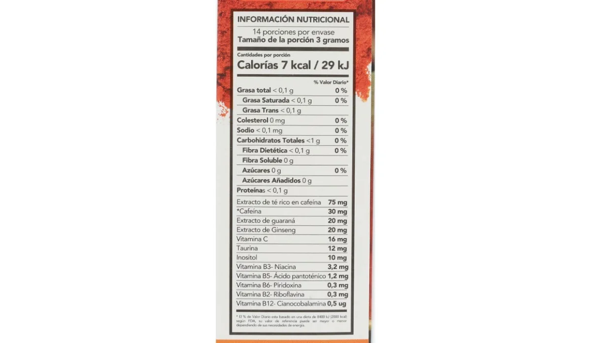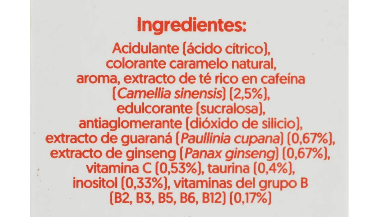 - Acidulante (ácido cítrico), colorante caramelo natural, aroma extracto de té rico en cafeína (camellia sinensis) (2,5%), edulcorante (sucralosa), antiaglomerante (dióxido de silicio), extracto de guaraná (paullinia cupana), (0,67%), extracto de ginseng (panax ginseng) (0,67%), vitamina C (0,53%), taurina (0,4%), inositol (0,33%), vitaminas del grupo B (B2, B3, B5, B6, B12) (0,17%).
