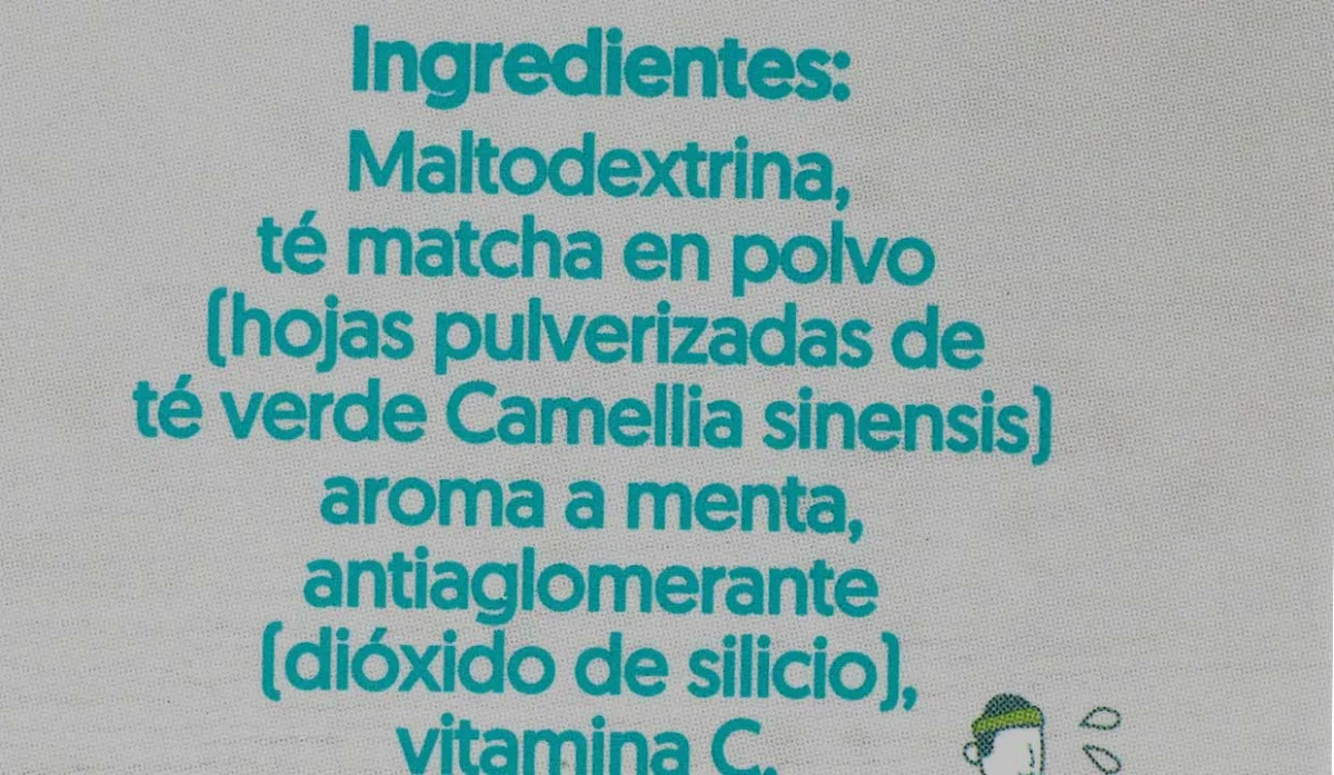 - Maltodextrina, té matcha en polvo (hojas pulverizadas de té verde Camellia sinensis), aroma a menta, antiaglomerante (dióxido de silicio), vitamina C.