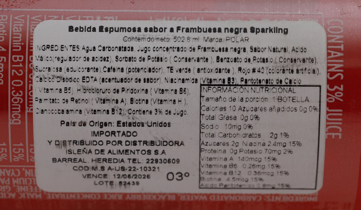 - Agua carbonatada, jugo concentrado de frambuesa negra, sabor natural, ácido cítrico (regulador de acidez), sorbato de potasio (conservante), benzoato de potasio (conservante), sucralosa (edulcorante), goma acacia (estabilizador), cafeína (potenciador), té verde (antioxidante), goma ester (estabilizador), calcido disódico (acentuador de acidez) niacinamida (vitamina B3), pantotenato de calcio (vitamina B5), rojo#40 (colorante artificial),.
