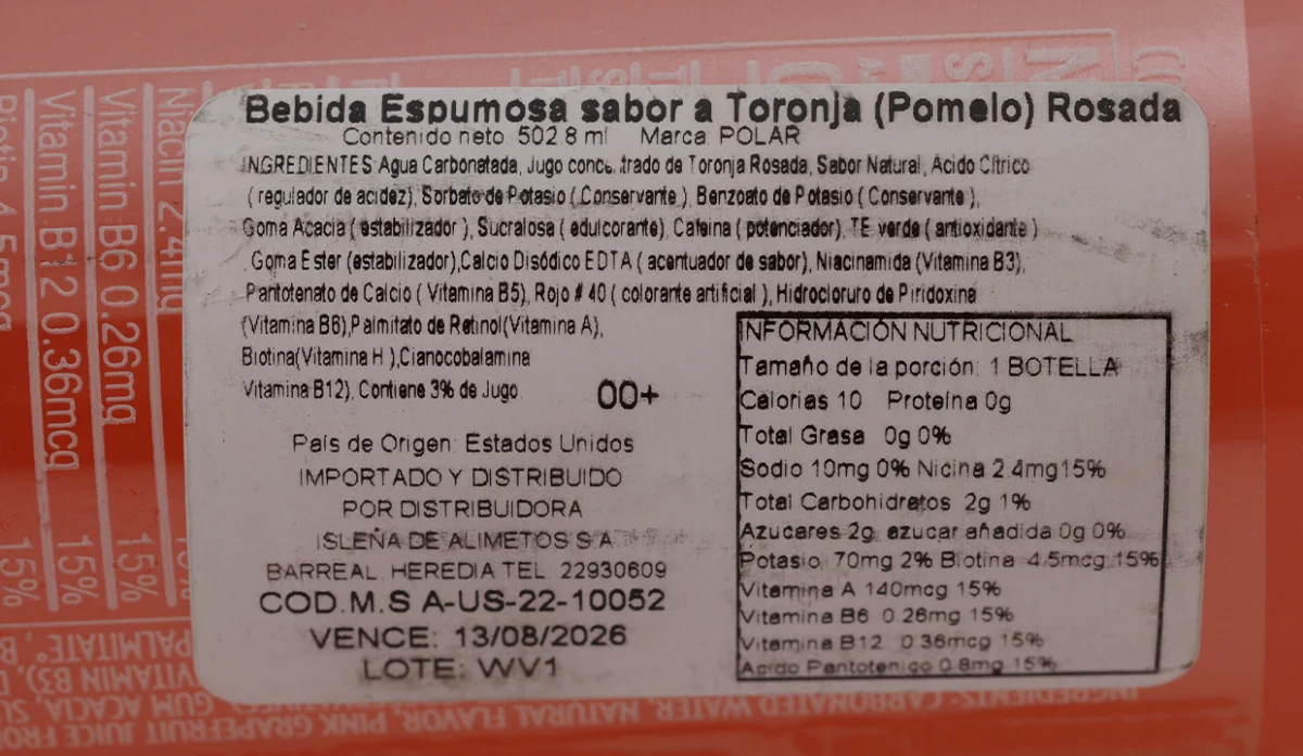 - Agua carbonatada, jugo concentrado de toronja rosado, sabor natural, ácido cítrico (regulador de acidez), sorbato de potasio (conservante), benzoato de potasio (conservante), goma acacia (estabilizador), sucralosa (edulcorante), cafeína (potenciador), té verde (antioxidante), goma ester (estabilizador), calcio disódico (acentuador de sabor), niacinamida (vitamina B3), pantotenato de calcio (vitamina B5), rojo #40 (colorante artificial), hidrocionuro de piridoxina (vitamina B6), palmitato de ret.