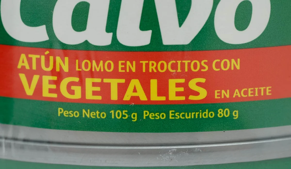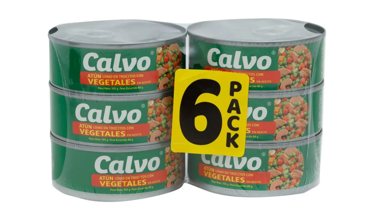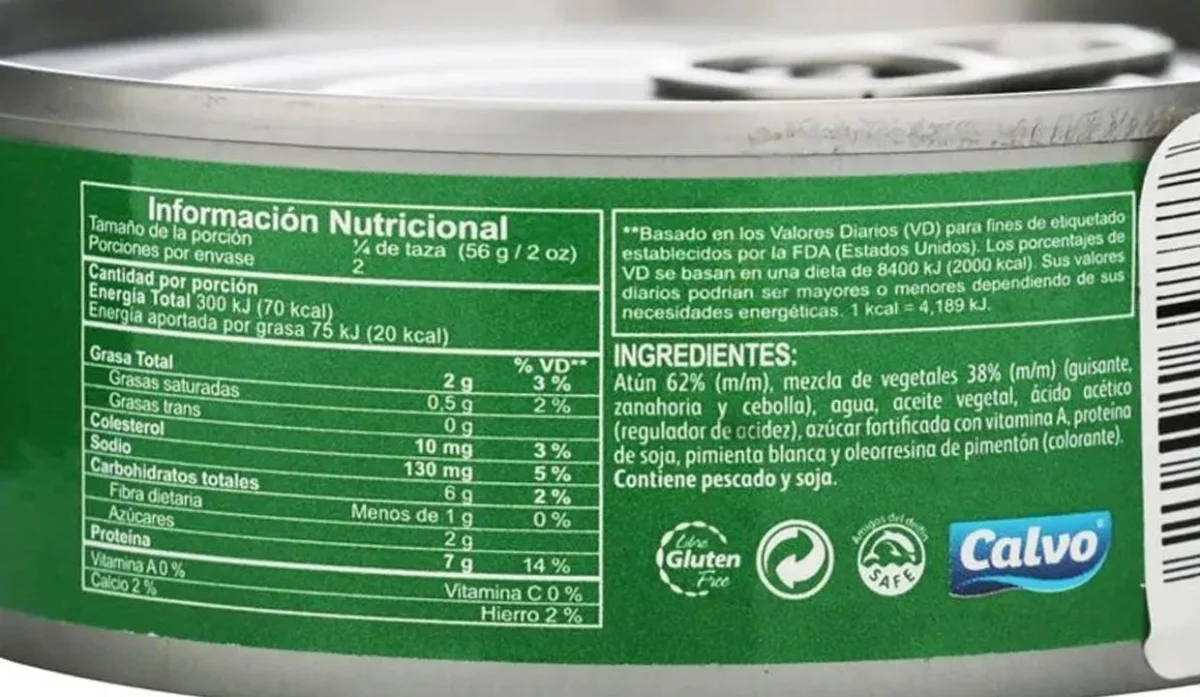 - Atún 62%, mezcla de vegetales 38% (guisante, zanahoria y cebolla), agua, aceite vegetal, ácido acético (regulador de acidez), azúcar fortificada con vitamina A, proteína de soja, pimienta blanca y oleorresina de pimentón (colorante).