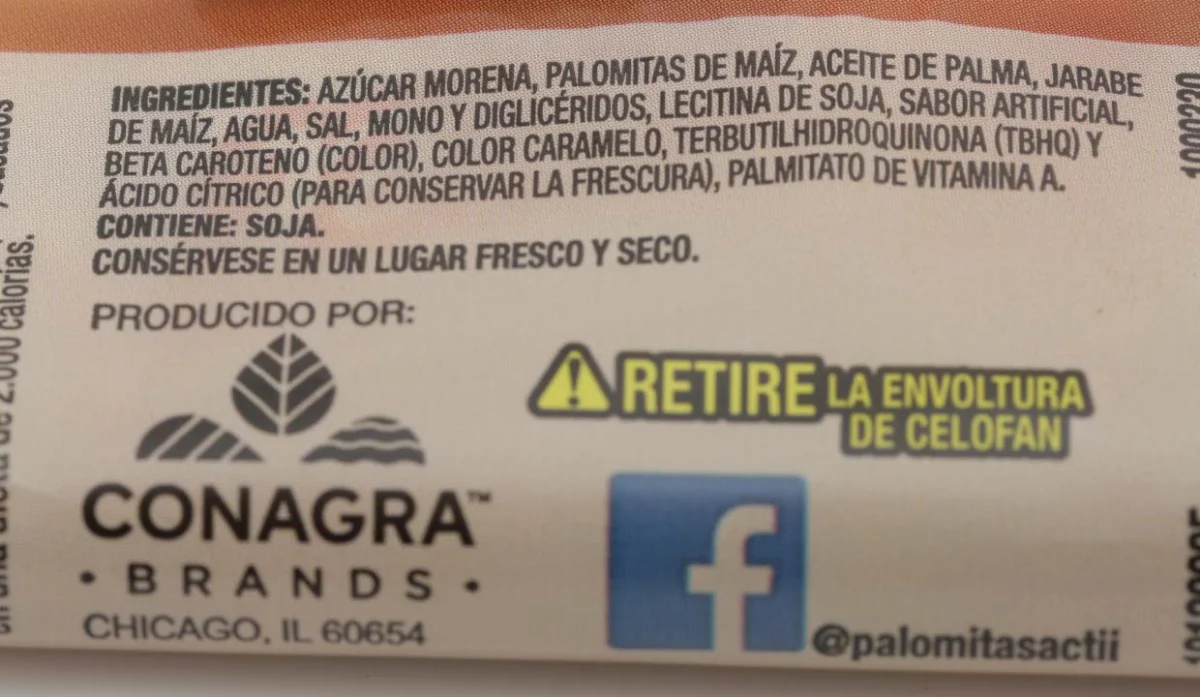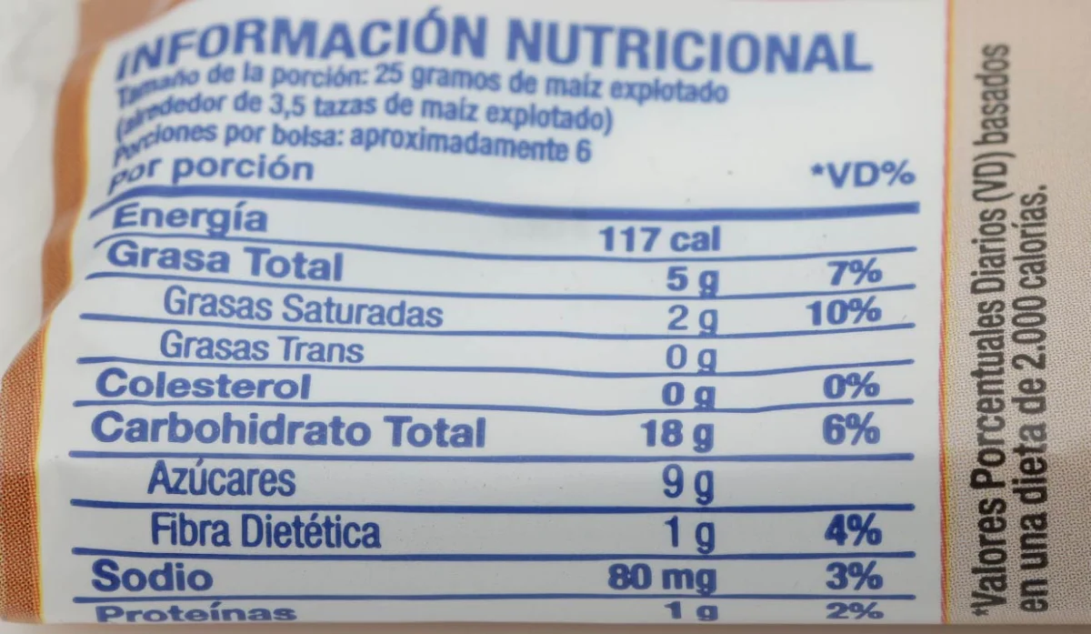 - Azúcar morena, palomitas de maíz, aceite de palma, jarabe de maíz, agua, sal, mono y diglicéridos, lecitina de soja, sabor artificial, beta caroteno (color), color caramelo, terbutilhidroquinona, ácido cítrico (para conservar la frescura), palmitato de vitamina A.