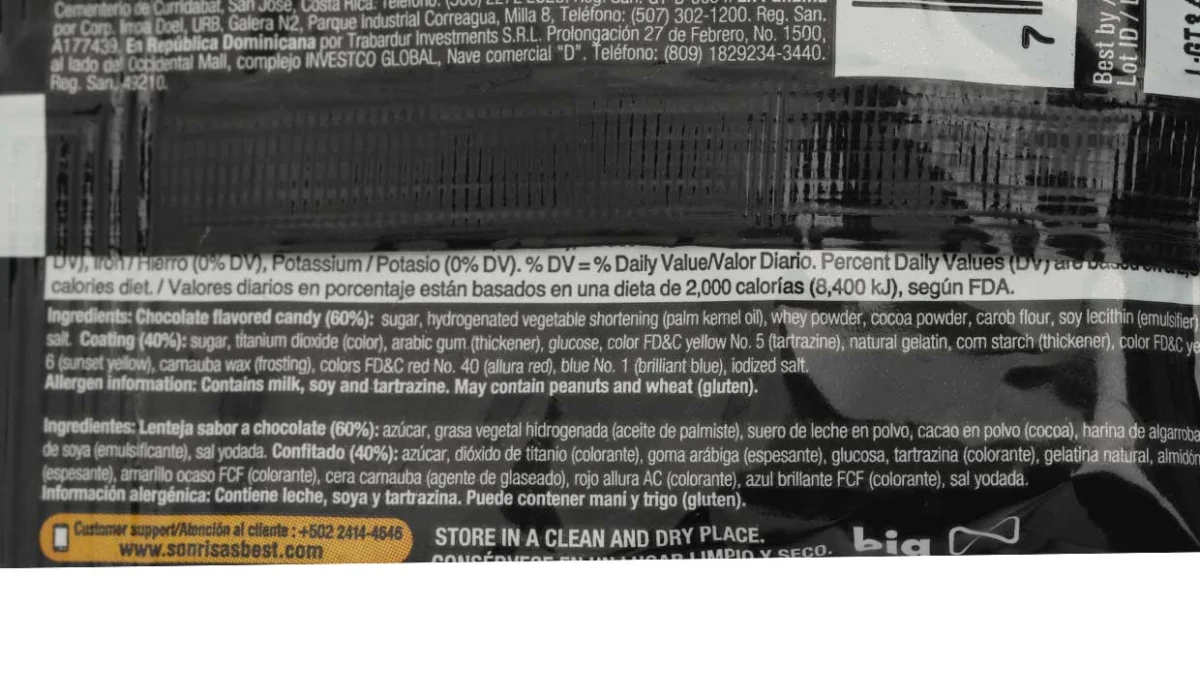 - Contiene: leche, soya y tartrazina, puede contener maní y trigo (gluten).