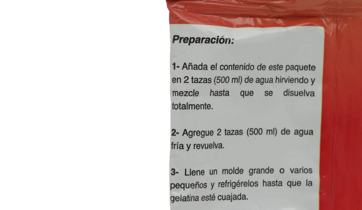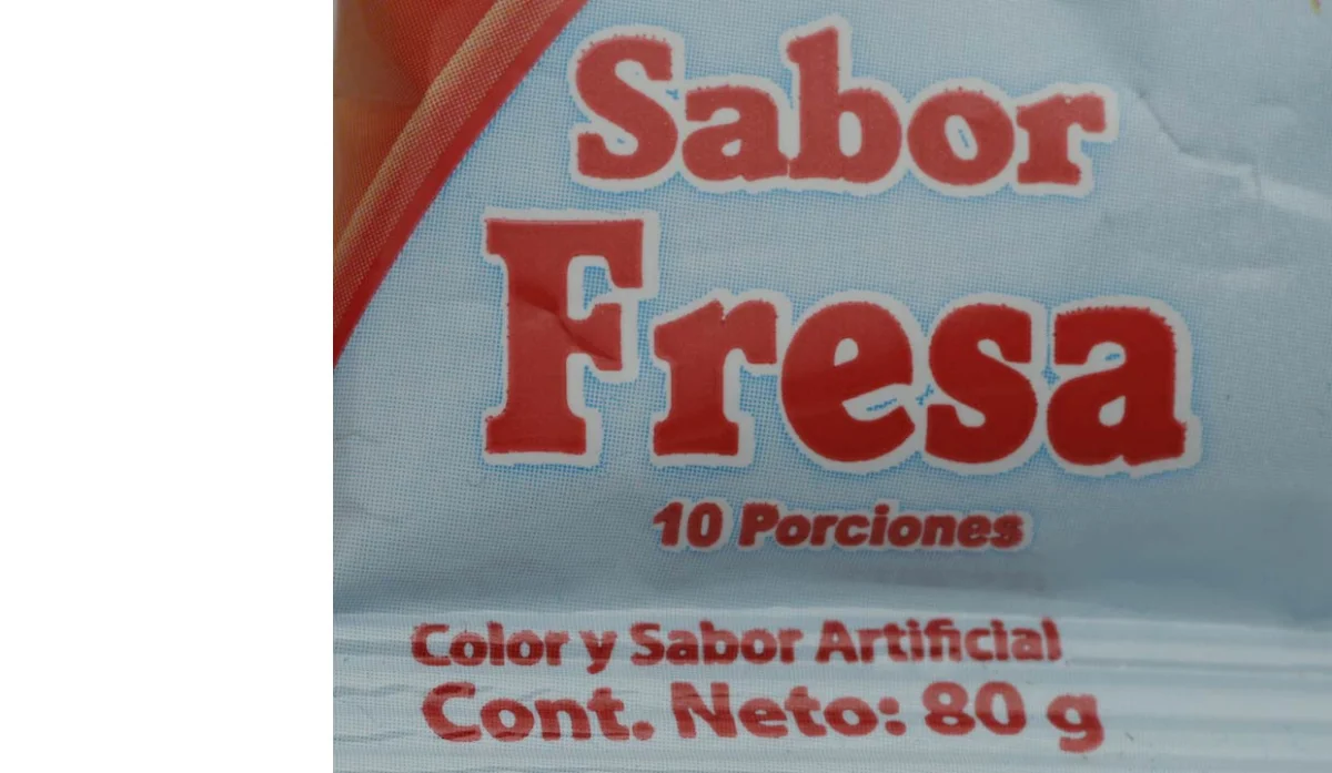 - Azúcar, gelatina, maltodextrina (emulsificante), sabor artificial a fresa, ácido fumárico (acidulante), citrato de sodio (regulador de acidez), aspartame y acesulfame (edulcorantes artificiales), premezcla vitamínica (vitamina A, C, hierro y ácido fólico), colorantes artificiales rojo#40 (altura), amarillo #5 (tartrazina).