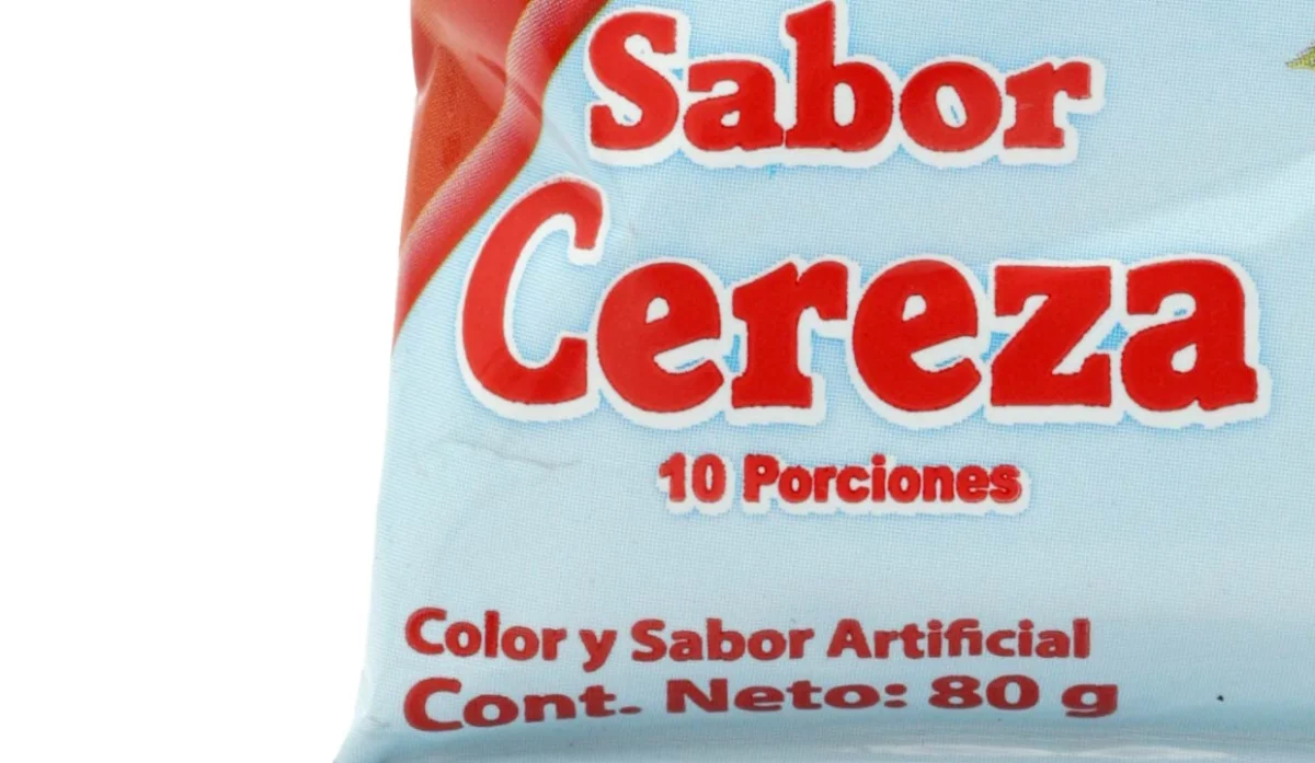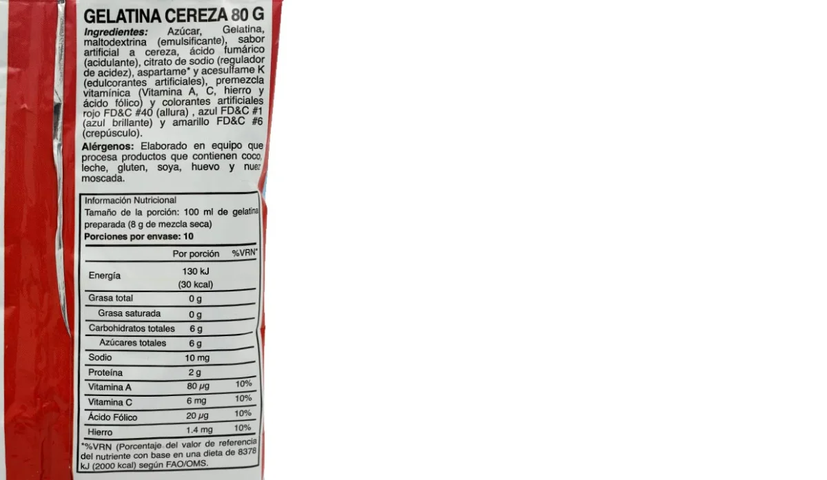 - Azúcar, gelatina, maltodextrina (emulsificante), sabor artificial a cereza, ácido fumárico (acidulante), citrato de sodio (regulador de acidez), aspartame y acesulfame (edulcorantes artificiales), premezcla vitamínica (vitamina A, C, hierro y ácido fólico), colorantes artificiales rojo#40 (altura), azul #1 (azul brillante).