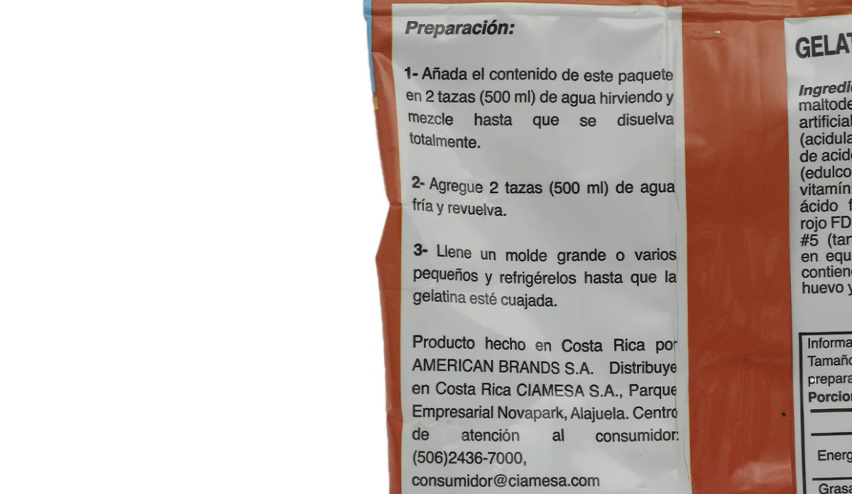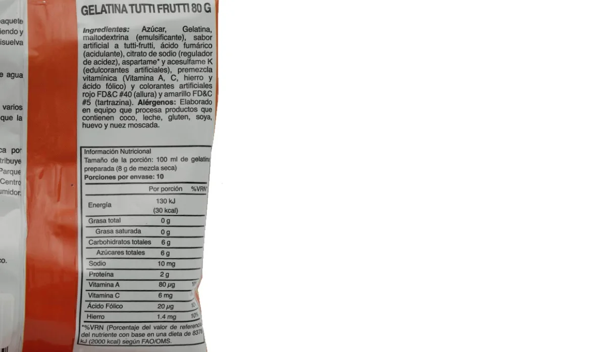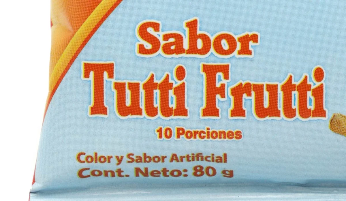 - Azúcar, gelatina, maltodextrina (emulsificante), sabor artificial a tutti frutti, ácido fumárico (acidulante), citrato de sodio (regulador de acidez), aspartame y acesulfame (edulcorantes artificiales), premezcla vitamínica (vitamina A, C, hierro y ácido fólico), colorantes artificiales rojo#40 (altura), amarillo #5 (tartrazina).