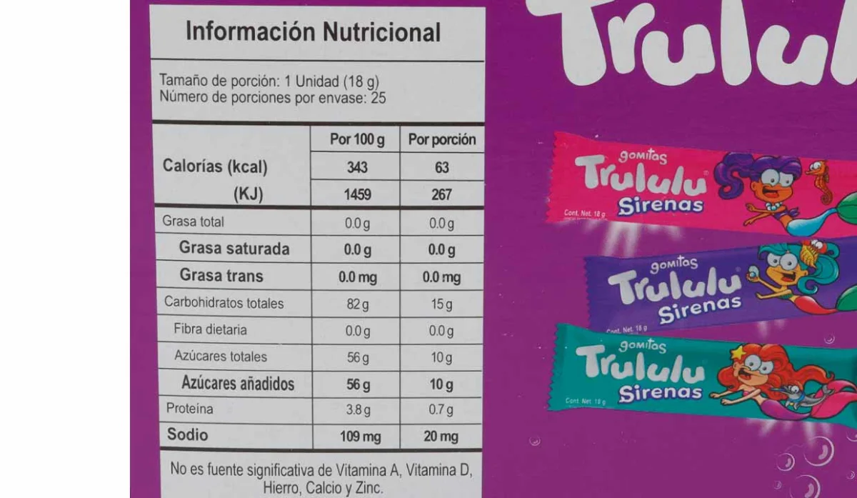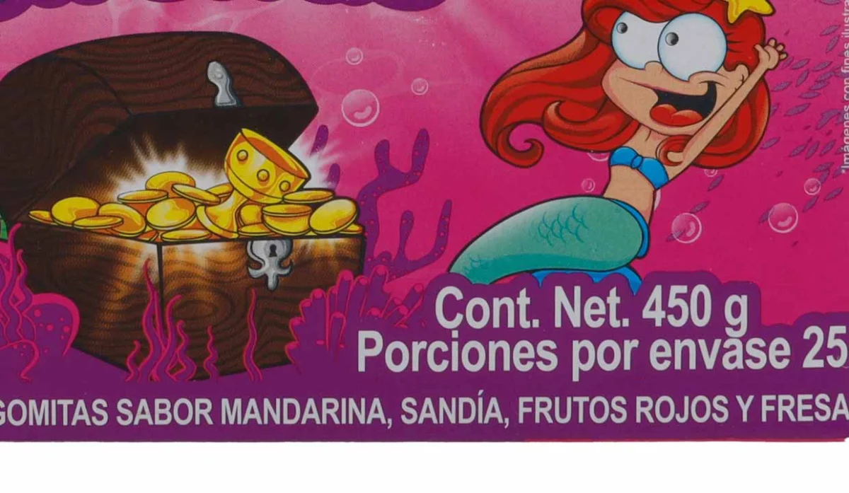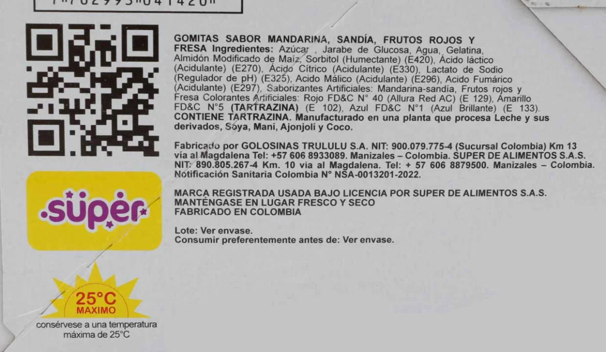 - Azúcar, jarabe de glucosa, agua, gelatina, almidón modificado de maíz, sorbitol (humectante), ácido láctico (regulador de pH), ácido málico (acidulante), ácido cítrico (acidulante), lactato de sodio (acidulante), saborizantes artificiales: mandarina, sandía, frutos rojos y fresa, colorantes artificiales rojo N40 (altura), amarillo N5 (tartrazina), azul N1 (brillante).