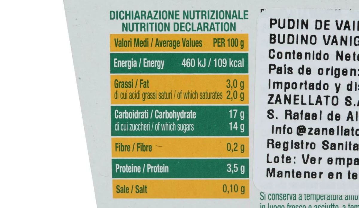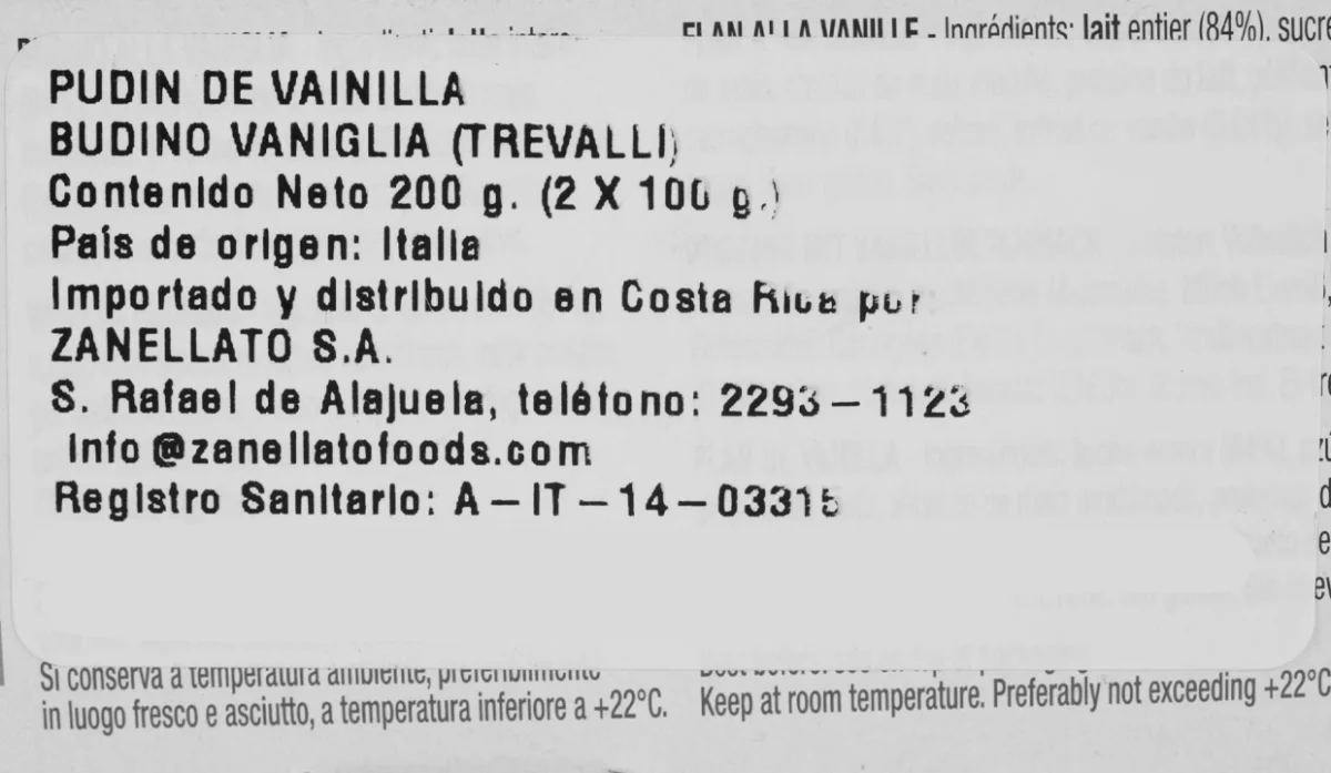 - Leche entera (84%), azúcar, almidón de maíz, almidón de maíz modificado, proteínas de leche, gelificante : carragenina (E407), aroma, extracto de vainilla (0,04%), sal, colorante: annatto (E160b).