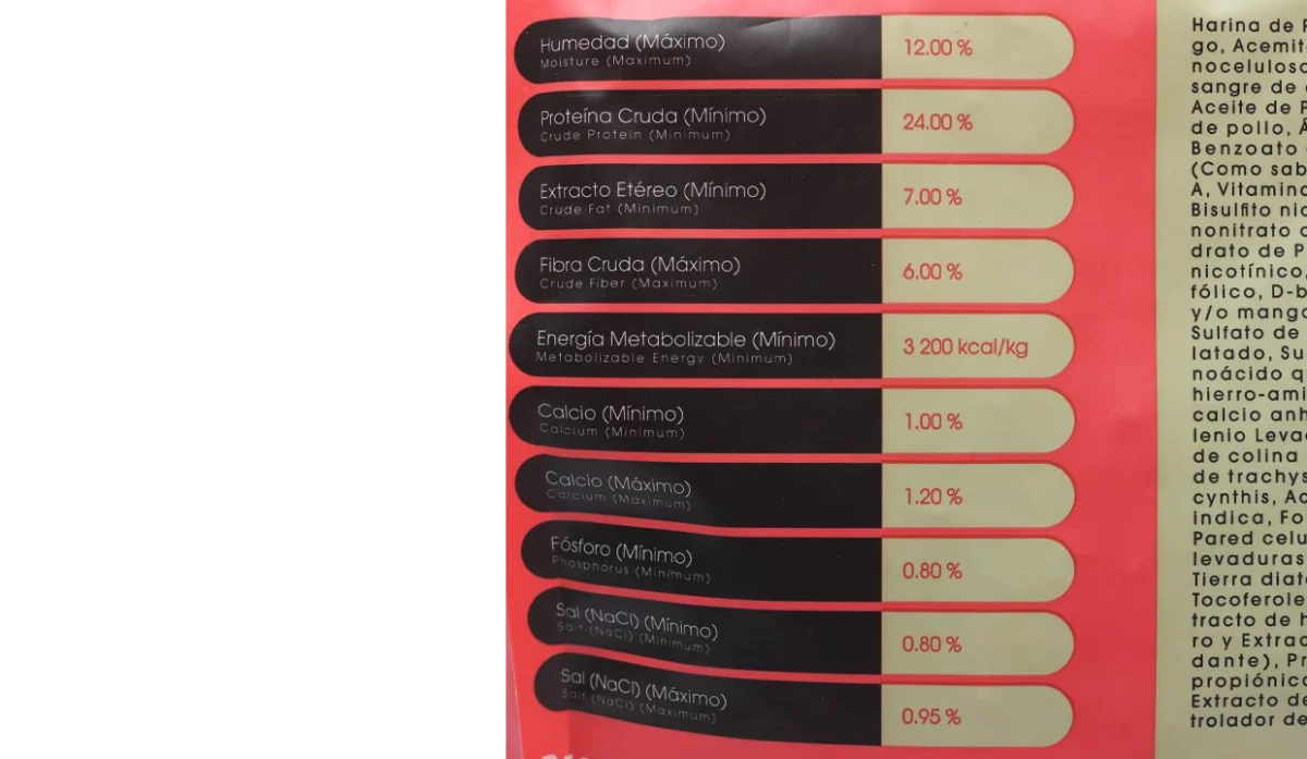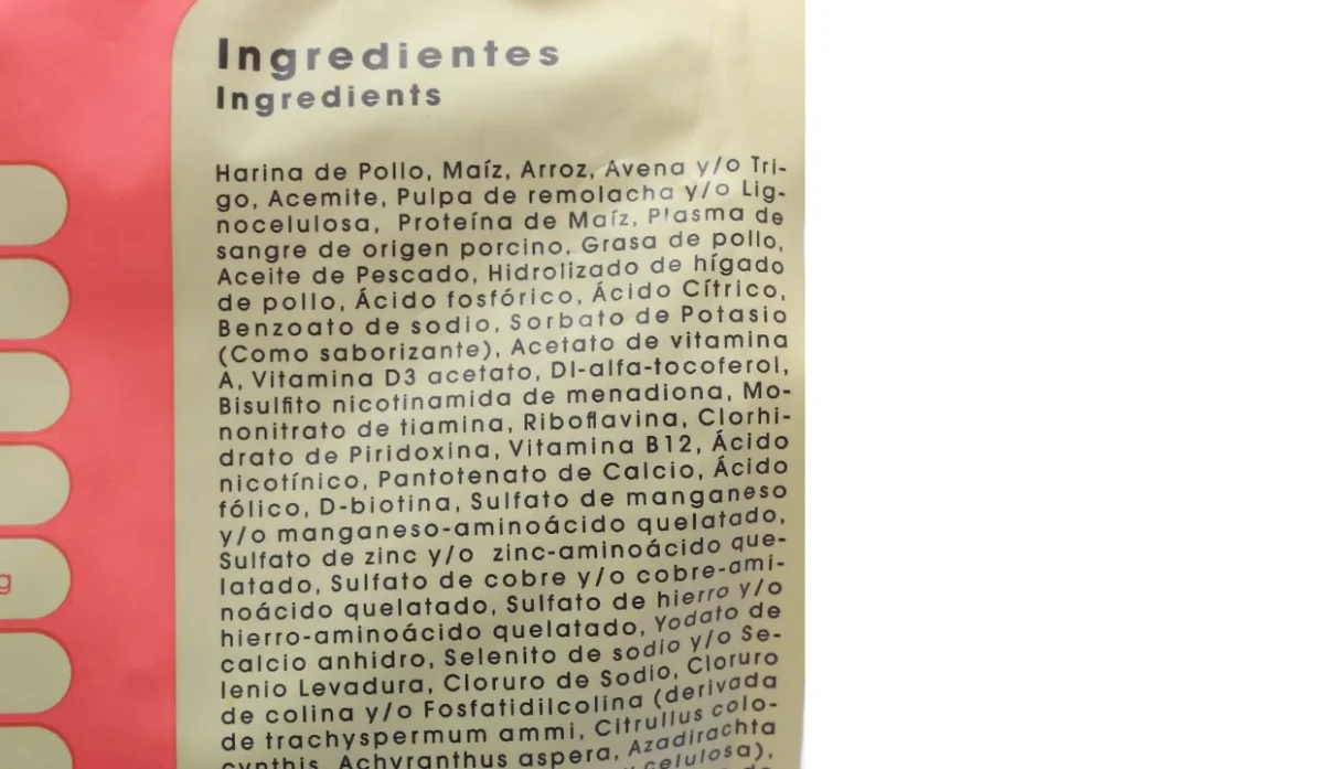 - Harina de pollo, maíz, arroz, avena y/o trigo, acemite, pulpa de remolacha y/o lignocelulosa, proteína de maíz, plasma de sangre de origen porcino, grasa de pollo, aceite de pescado, hidrolizado de hígado de pollo, ácido fosfórico, ácido cítrico, benzoato de sodio, sorbato de potasio (como acidulante), acetato de vitamina A, D3 acetato, di alfa tocoferol, bisulfito nicotinamidade menadiona, mononitrato de tiamina, riboflavina, clorhidrato de piridoxina, vitamina B12, ácido nicotínico.