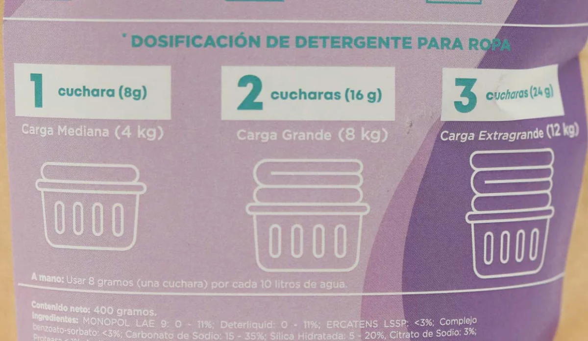- Usar 24 gramos (tres cucharas) para lavado de carga extragrande (12kg).