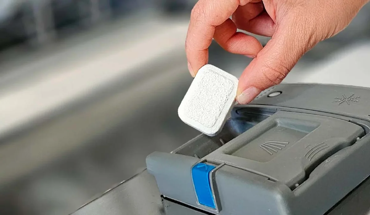 - Con las manos secas coloque la tableta en el depósito de dosificación de la máquina lavaplatos.