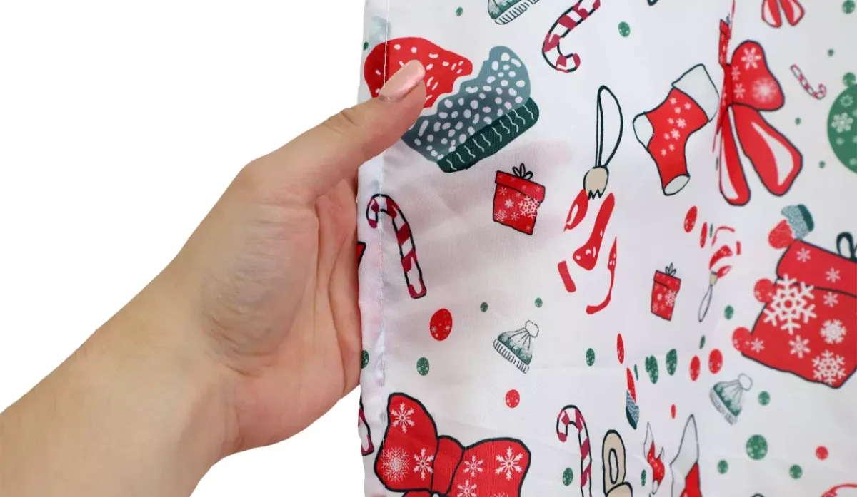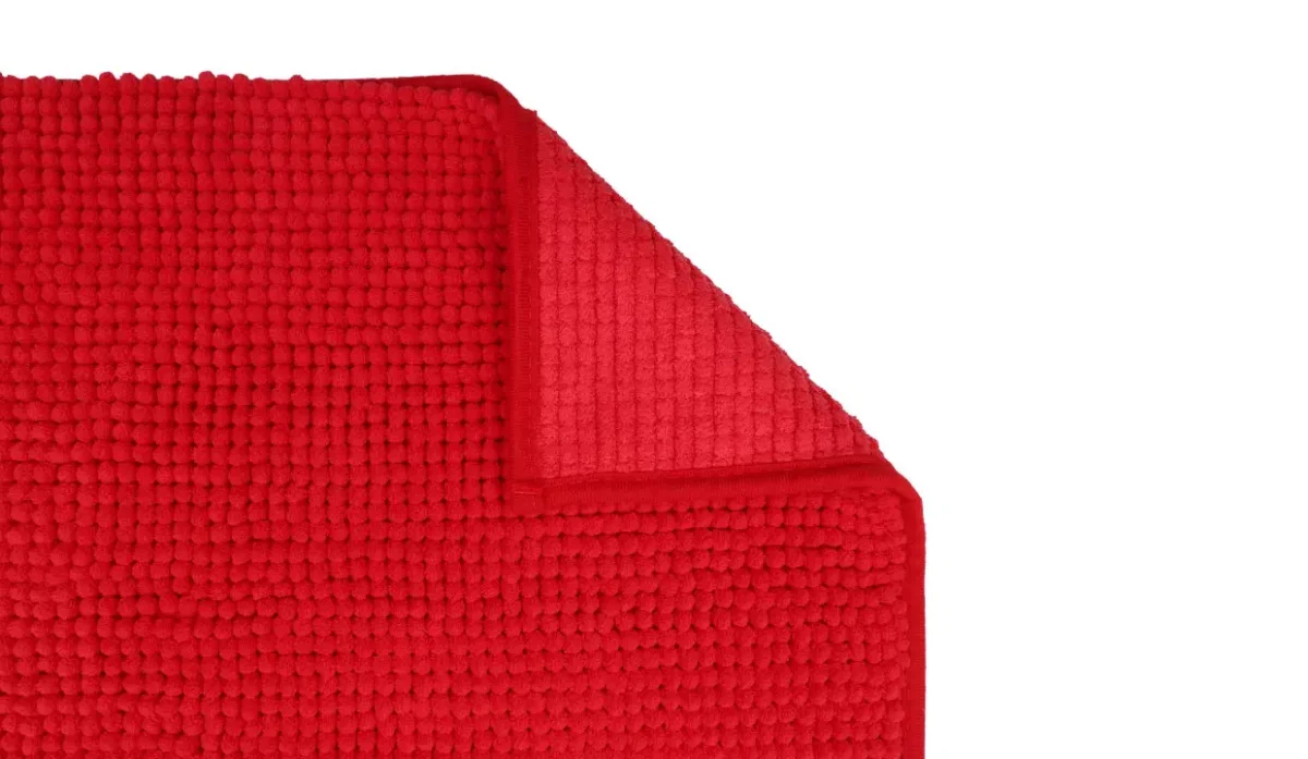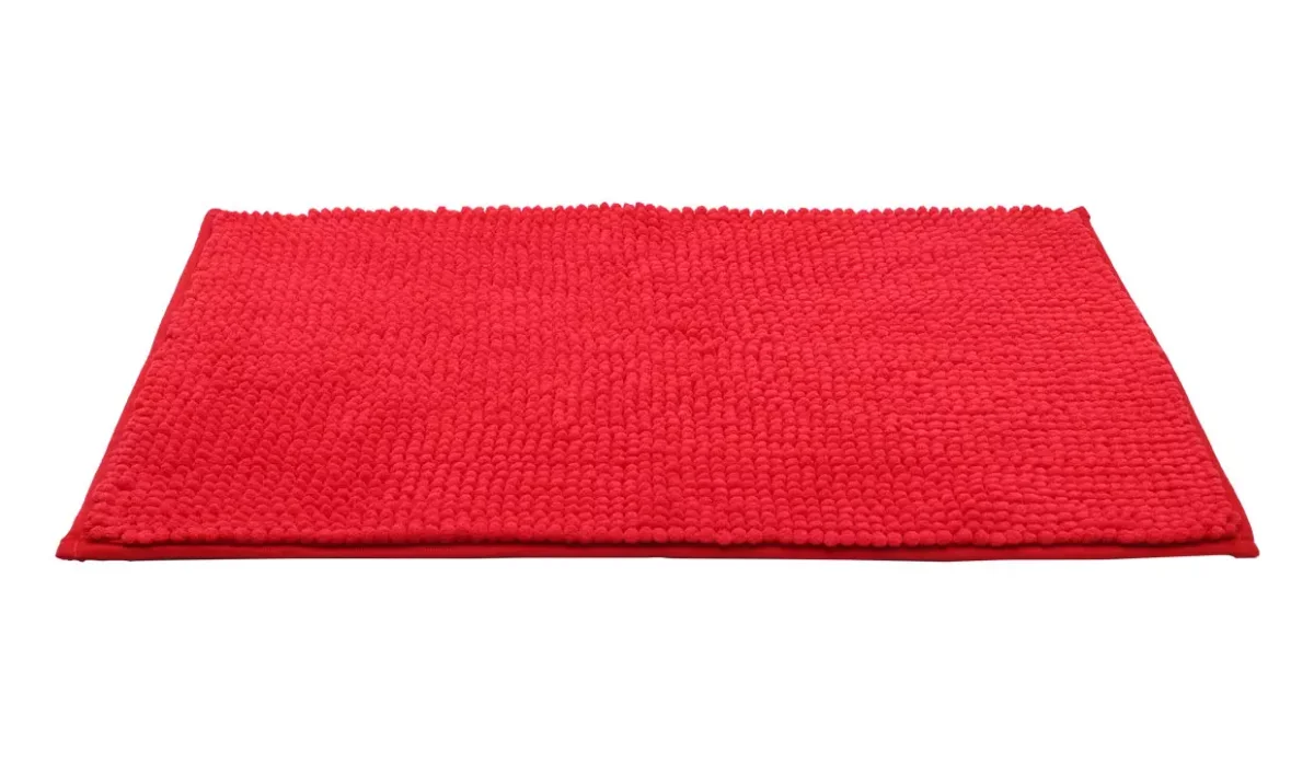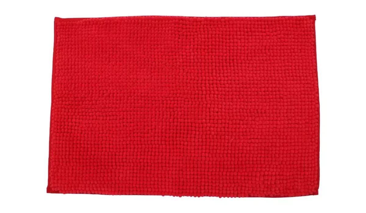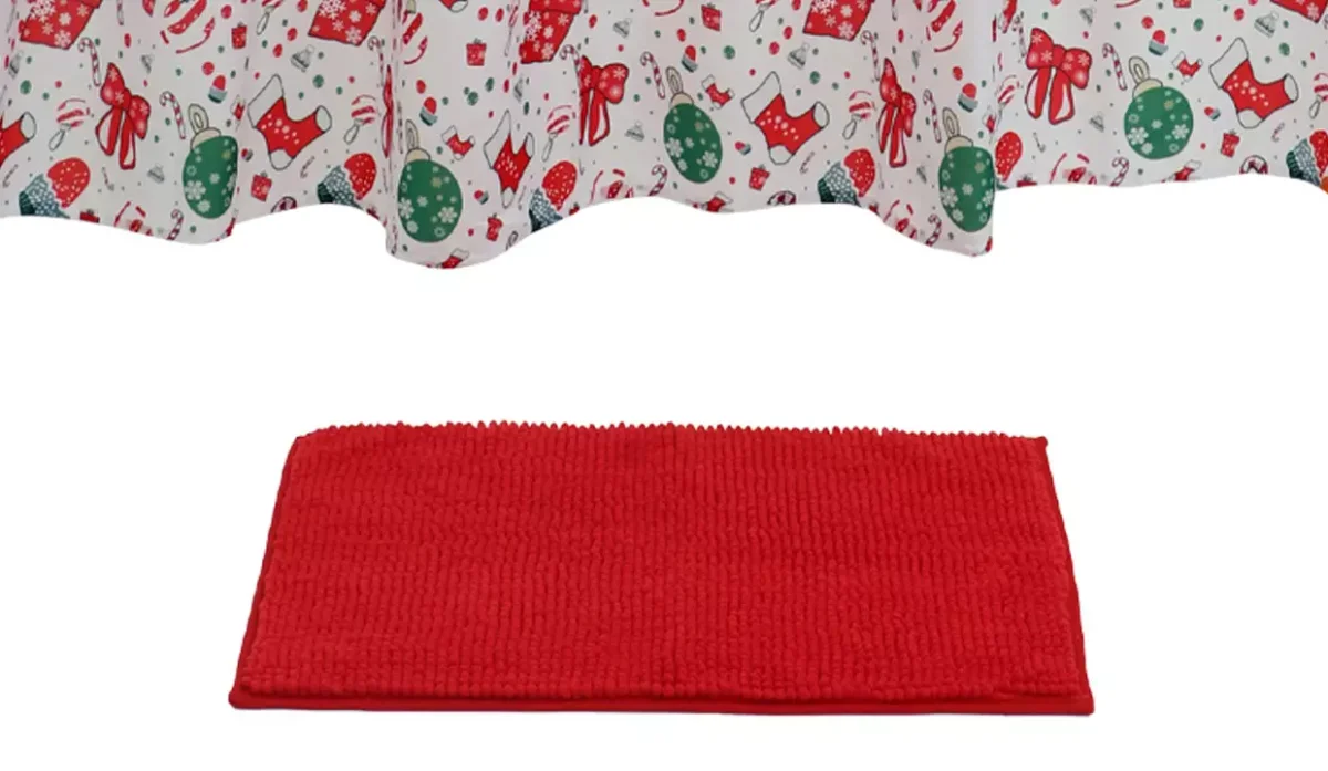 - Cortina de poliéster, ganchos de metal y alfombra de cheline.