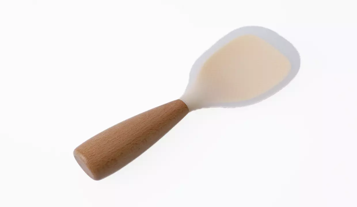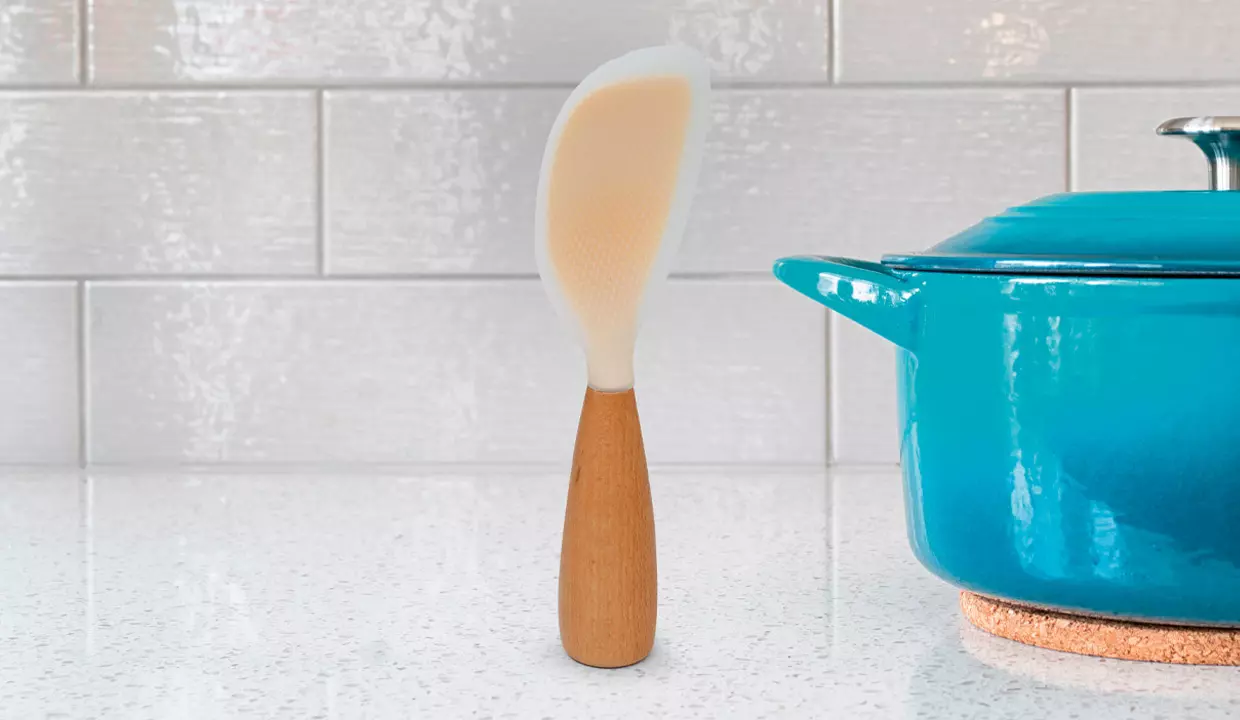 - Fabricada con mango de madera resistente y cuerpo de silicona suave y duradera.