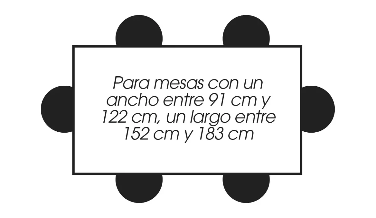 - Recomendado para mesas con un ancho entre 91 cm de ancho hasta 122 cm y un largo entre 152 cm y 183 cm.