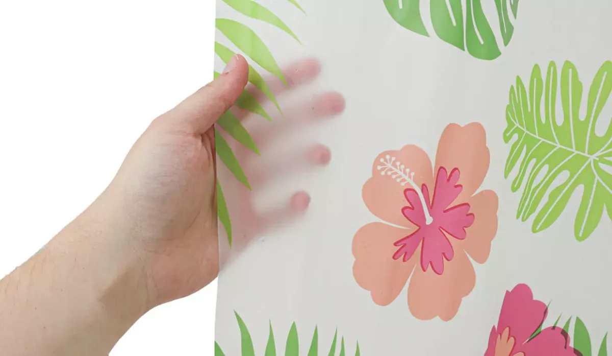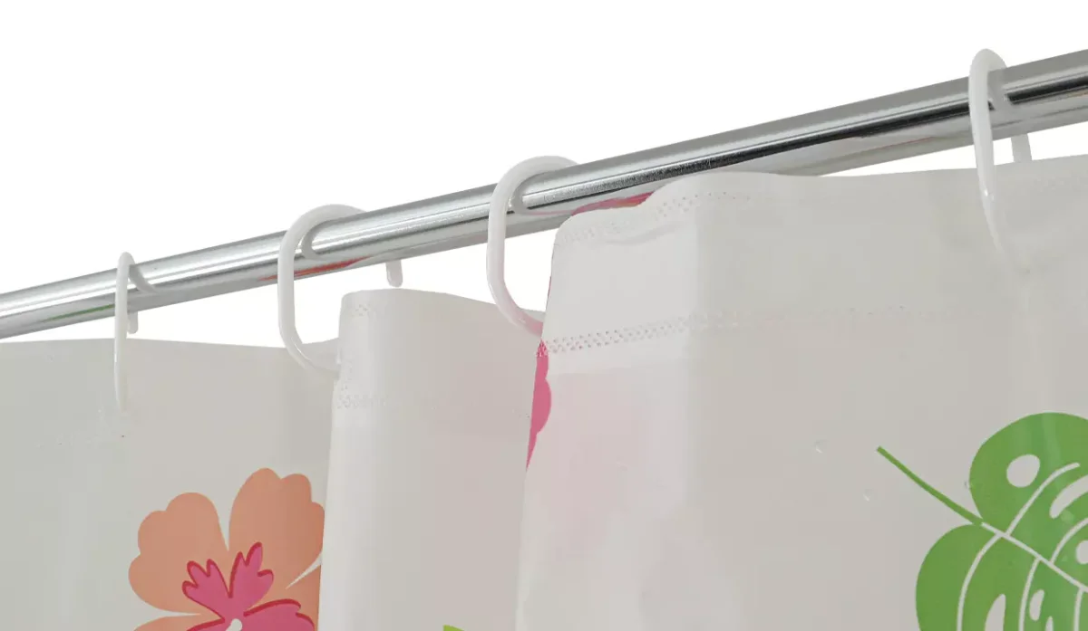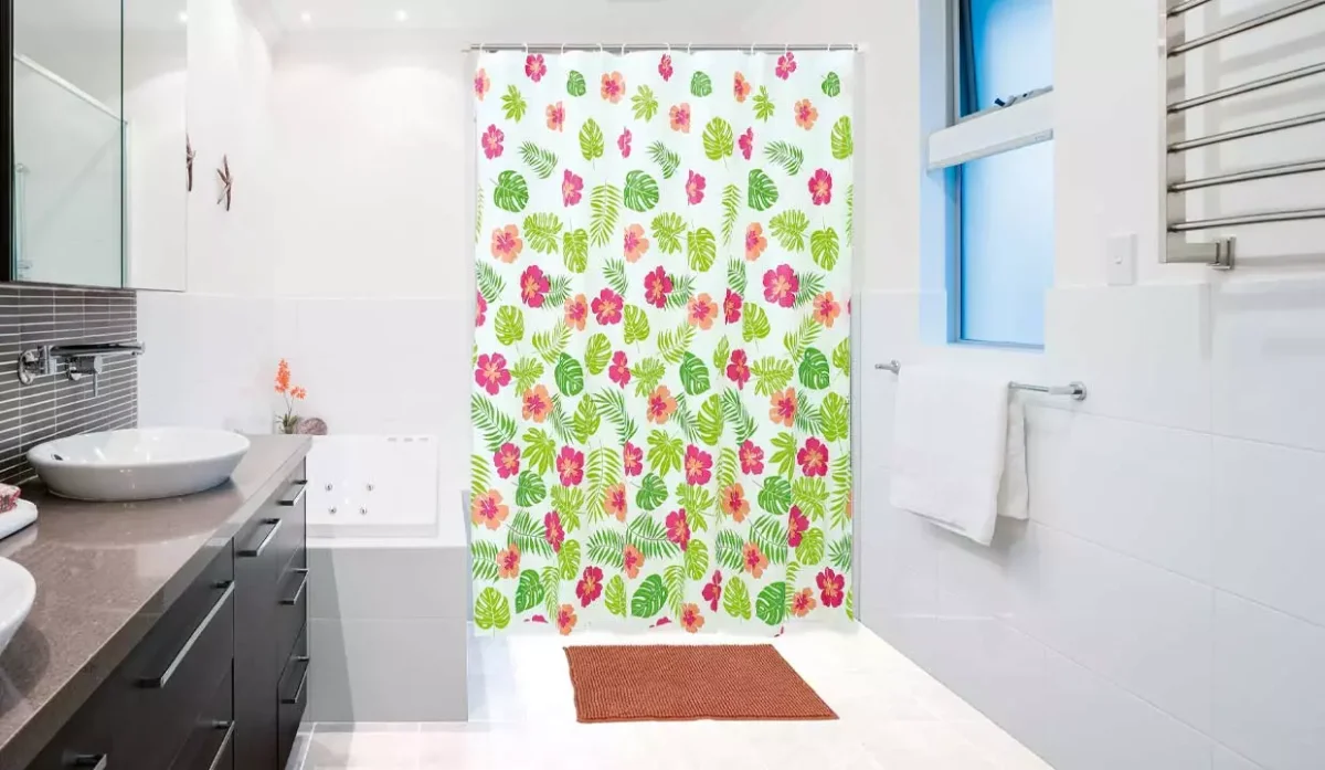 - Cortina de peva (plástico suave) y alfombra de poliéster.