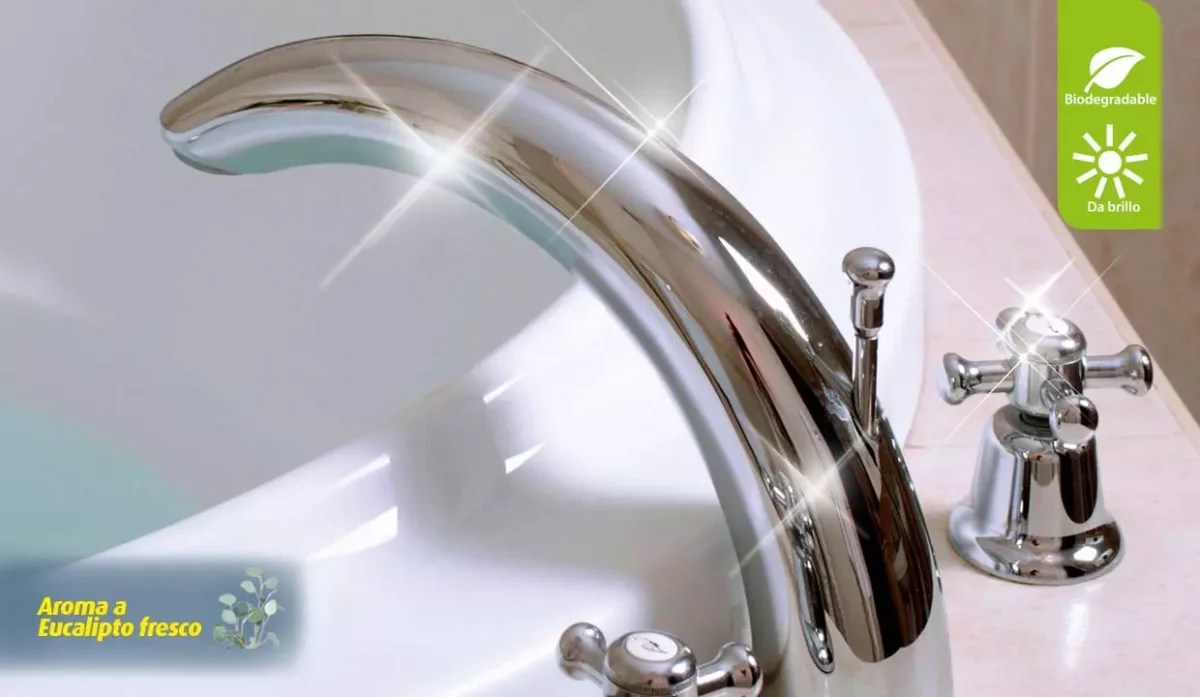 - Ideal para usar en el lavamanos, tinas, inodoros, puertas de ducha, fregaderos y superficies cromadas.