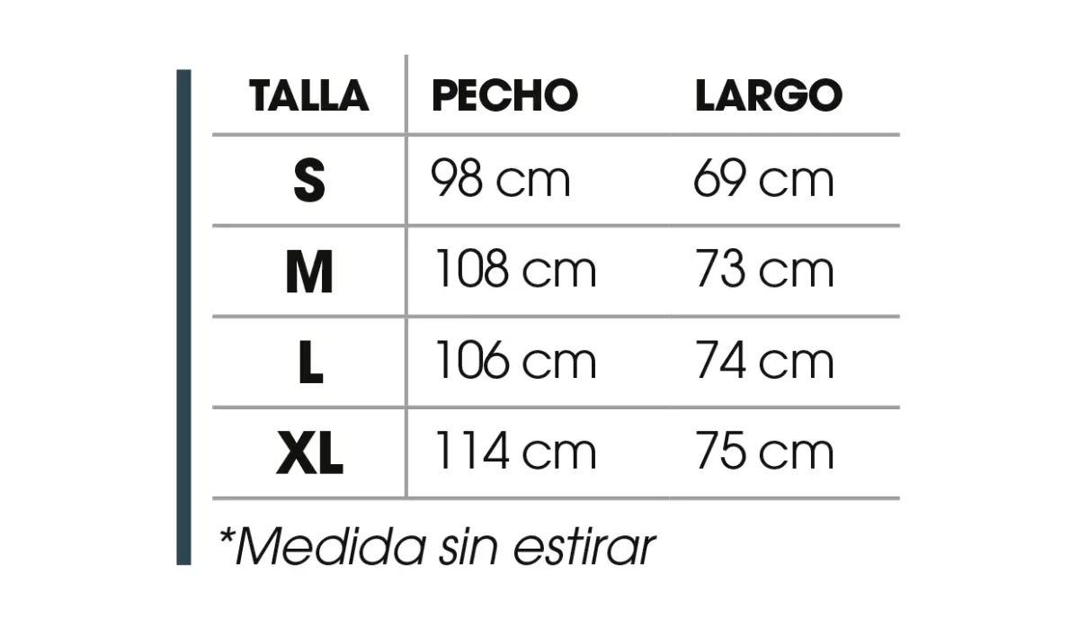 - Pecho: 106 cm (sin estirar).