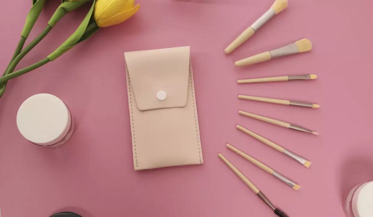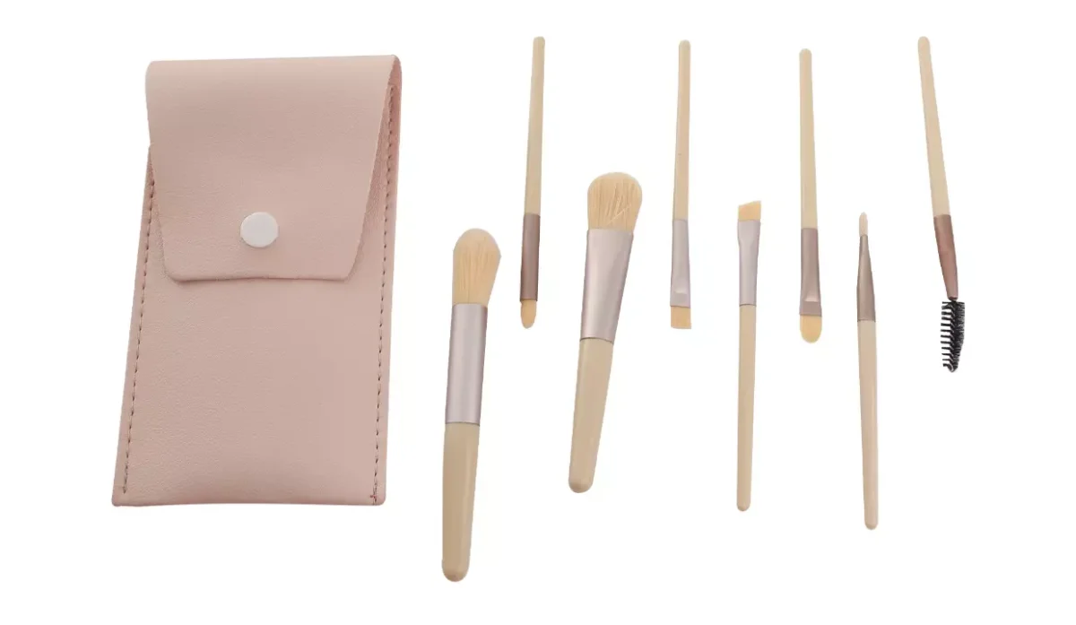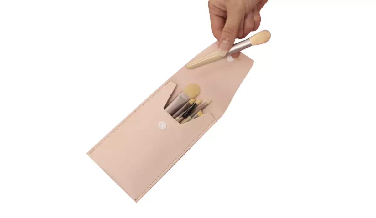 - Estuche rosado y brochas beige con plateado.
