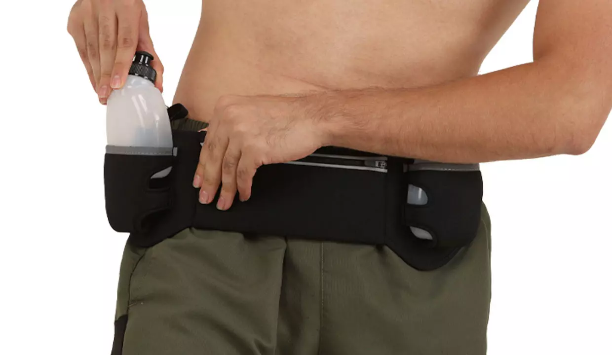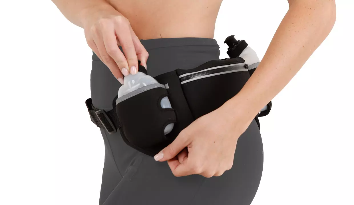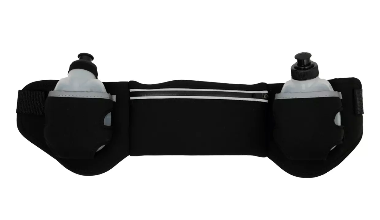 - Canguro: 2 espacios y sujetadores para colgar las botellas, cierre con zipper, banda reflectiva, correa ajustable con broche.