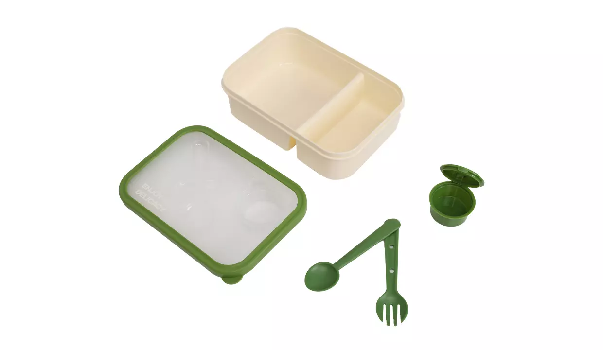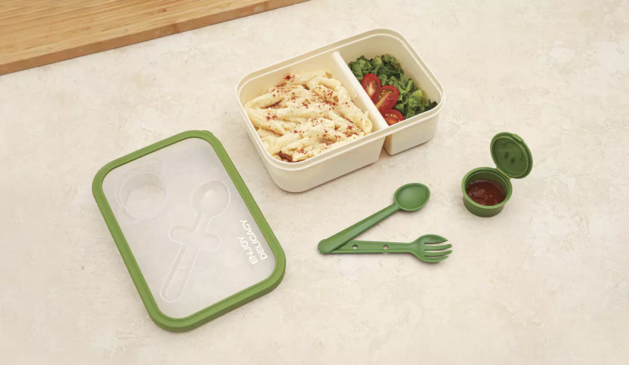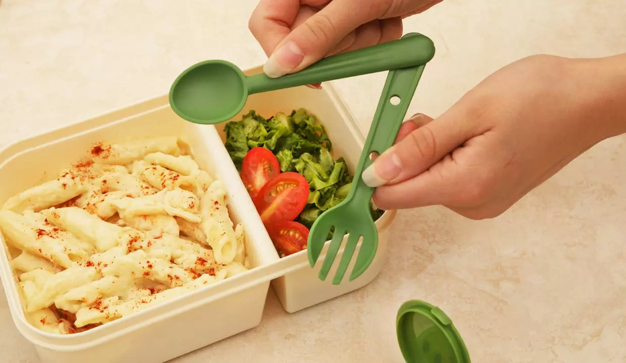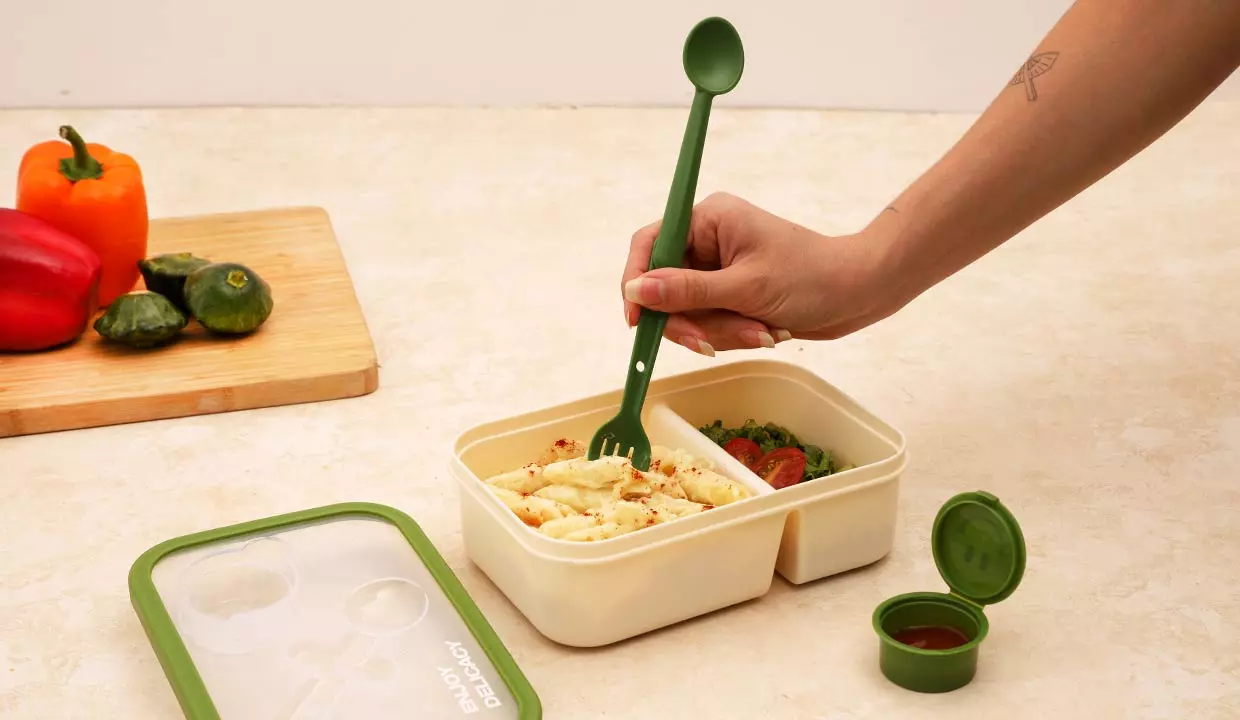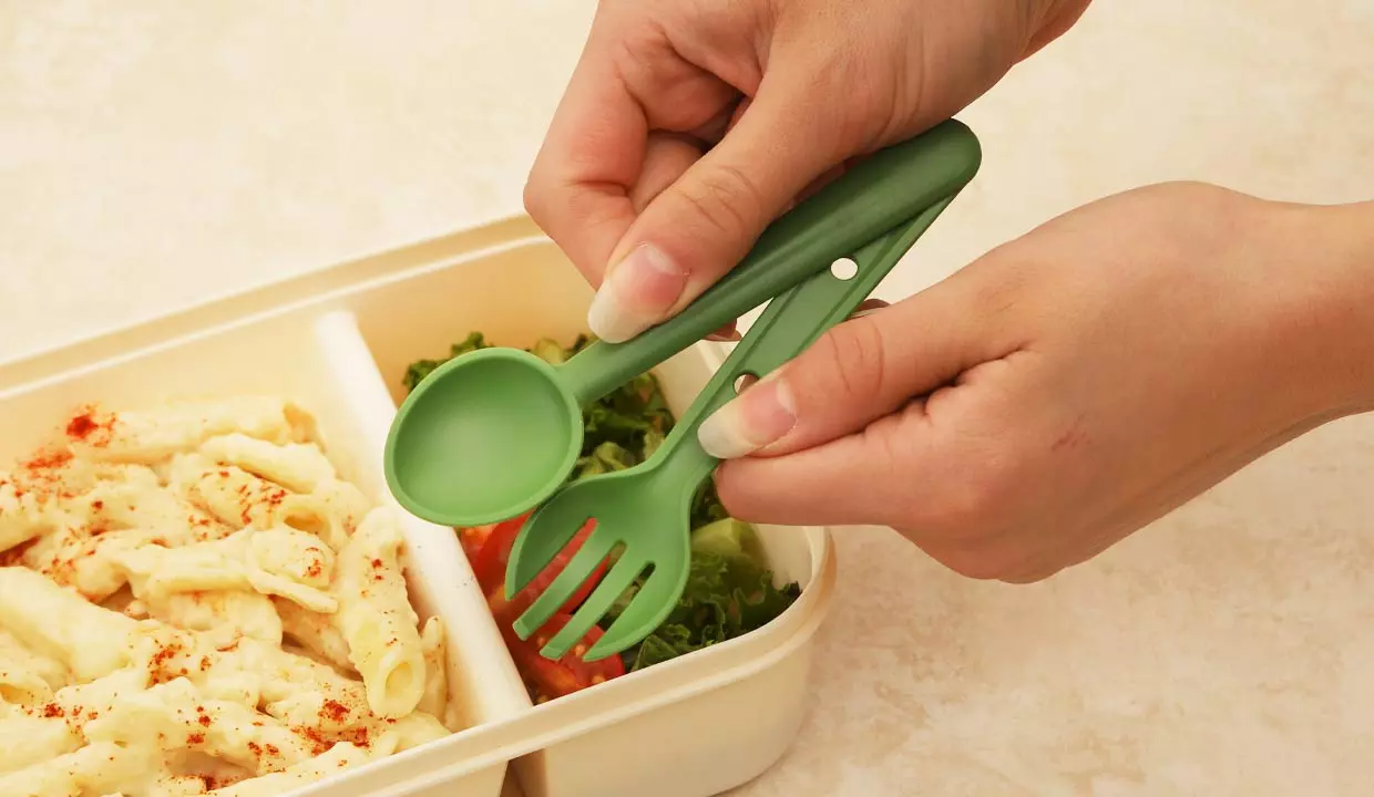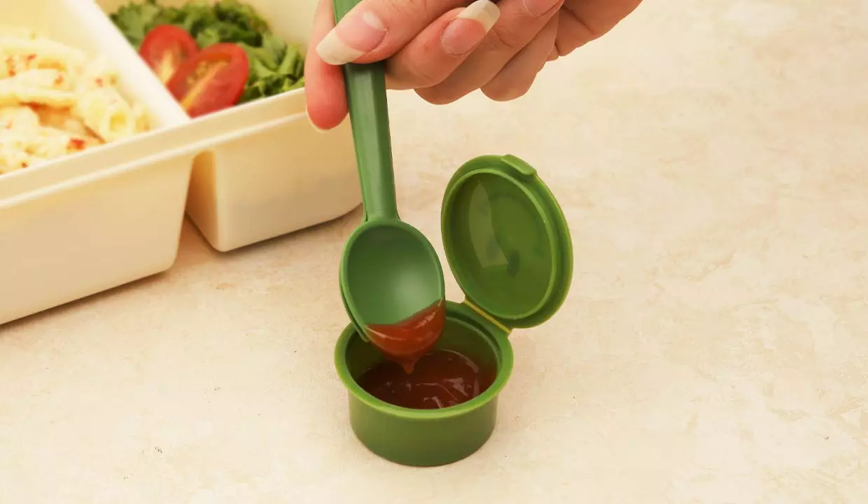- Mini recipiente y utensilios se acoplan a la tapa.