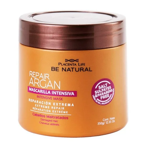 | Modo de uso: | 350 g La línea Repair Argan de Be Natural es un tratamiento reparador intensivo de acción inmediata a base de aceite de argán ingrediente de alto contenido en ácidos grasos y vitamina E que ayudan a tratar el cabello maltratado para un cabello sedoso en solo unos minutos. Cruelty Free - No testado en animales. No contiene sulfatos ni parabenos. • Mascarilla Repair Argan de Be Natural es un tratamiento reparador intensivo a base de aceite de argán ingrediente de alto contenido en ácidos grasos y vitamina E que ayudan a tratar el cabello maltratado. Además fortalece las fibras capilares aportando elasticidad y manejabilidad reduciendo a su vez el encrespamiento. Modo de empleo: Aplicar en el cabello limpio de medios a puntas y deja actuar de 3 a 5 minutos. Para cabello extremad |
