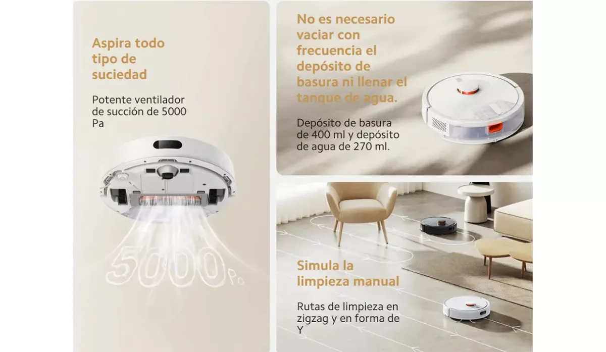 | 3 niveles de potencia con succión máxima de 5000 Pa | |