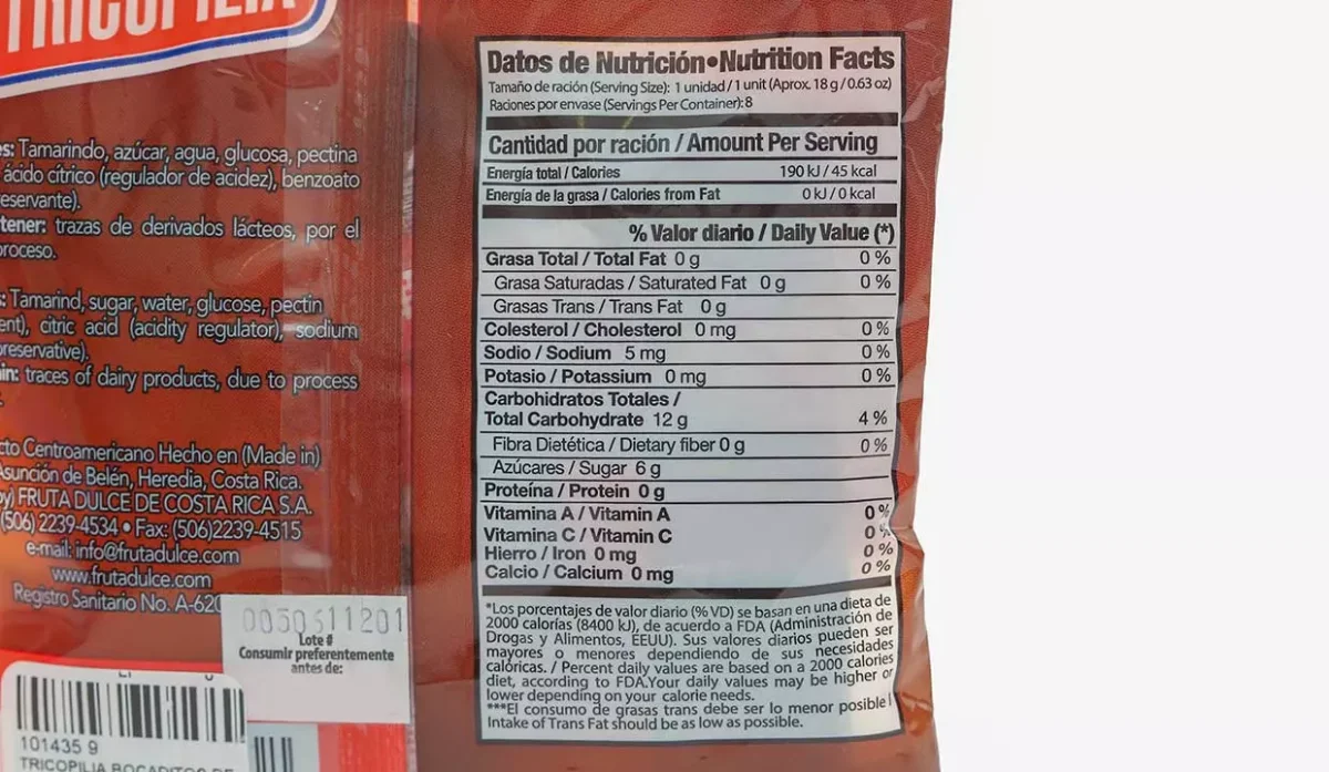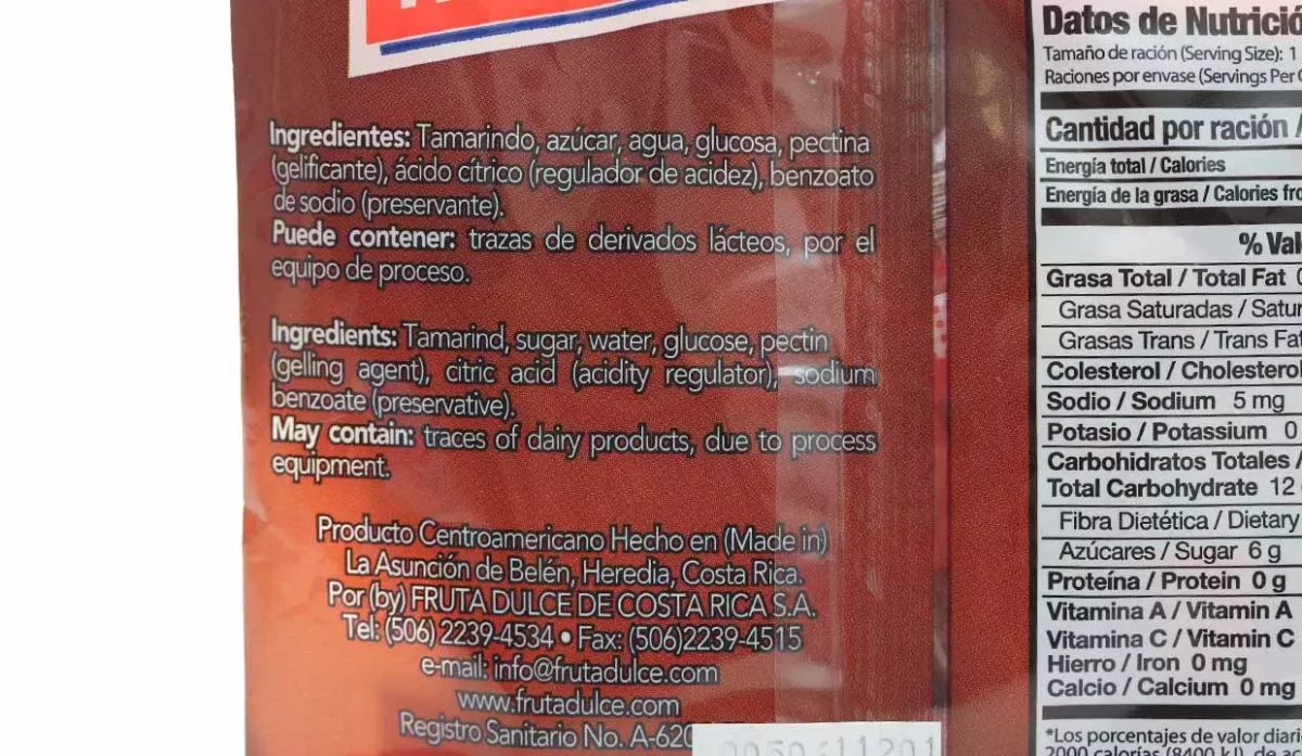 - Tamarindo, azúcar, agua, glucosa, pectina y ácido cítrico.