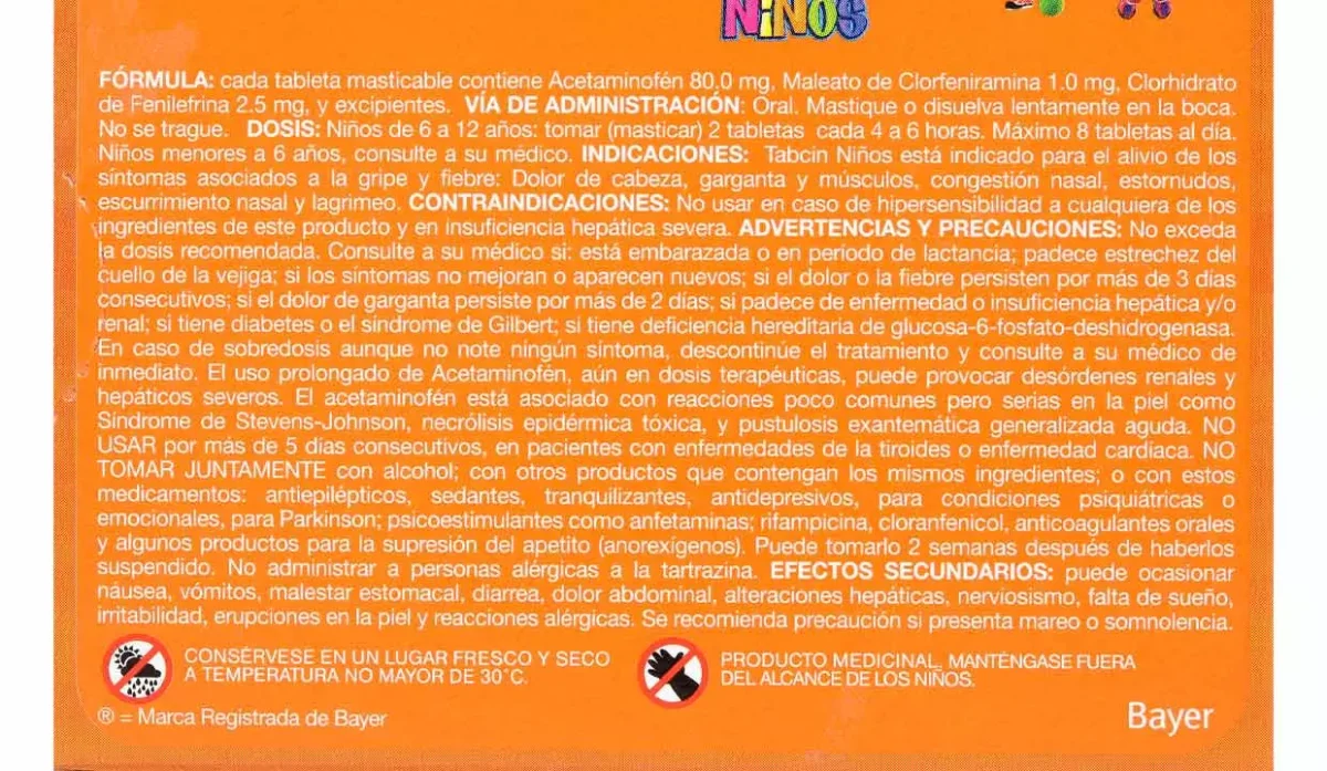 - Acetaminofén 80mg, clorhidrato de fenilefrina 2,5mg, maleato de clorfeniramina 1mg y excipientes.