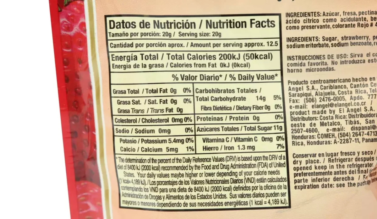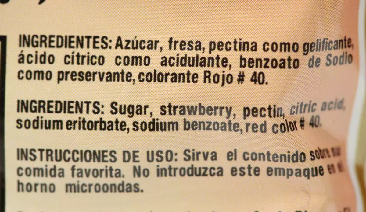 Azúcar, fresa, ácido cítrico, benzoato de sodio y colorante rojo #40.