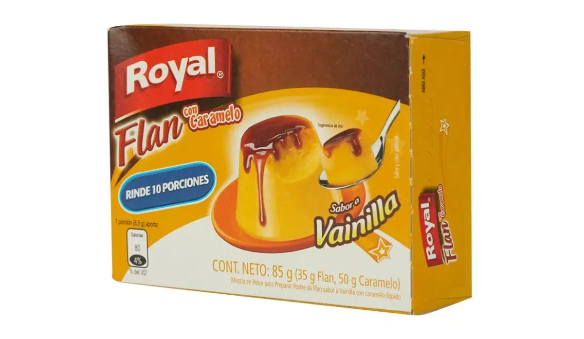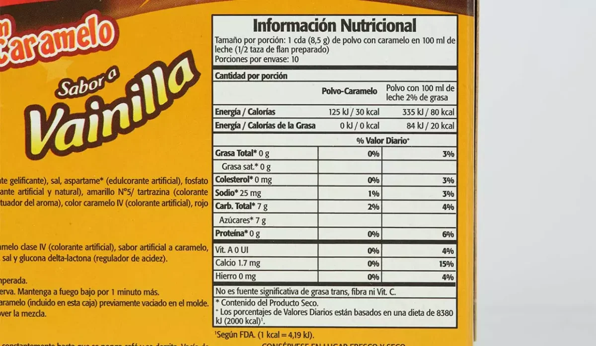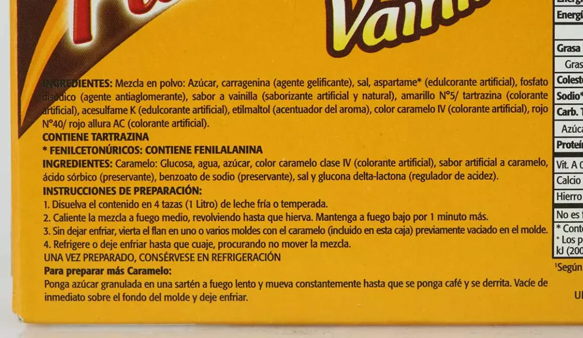 - Mezcla en polvo: azúcar, carragenina, sal, aspartame, sabor a vainilla y color caramelo.