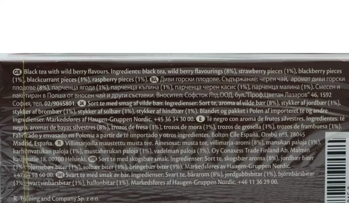 - Té negro, aromas de bayas silvestres, trozos de fresa, trozos de mora, trozos de grosella y trozos de frambuesa.