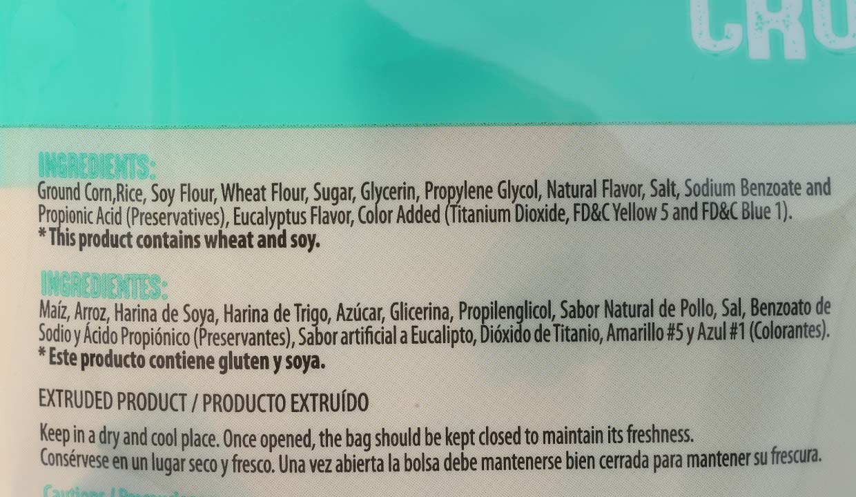 - Harina de arroz, harina de trigo, glicerina, gelatina de origen porcino, sabor natural a pollo, perejil, eucalipto, clorofila y sal.