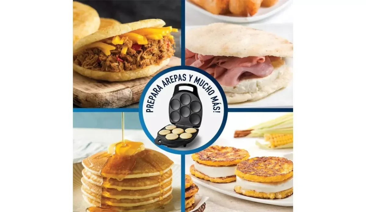 - Prepara deliciosas arepas para el desayuno, el almuerzo, la merienda y hasta la cena.