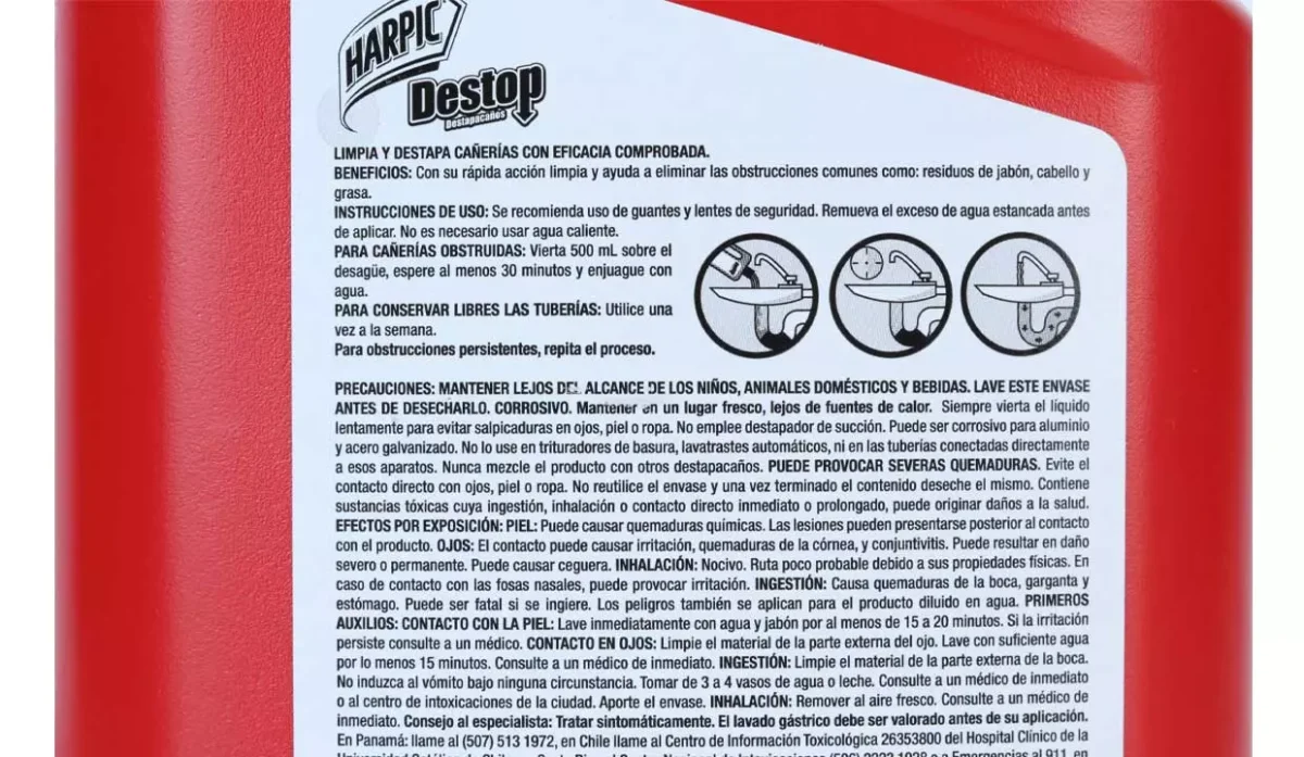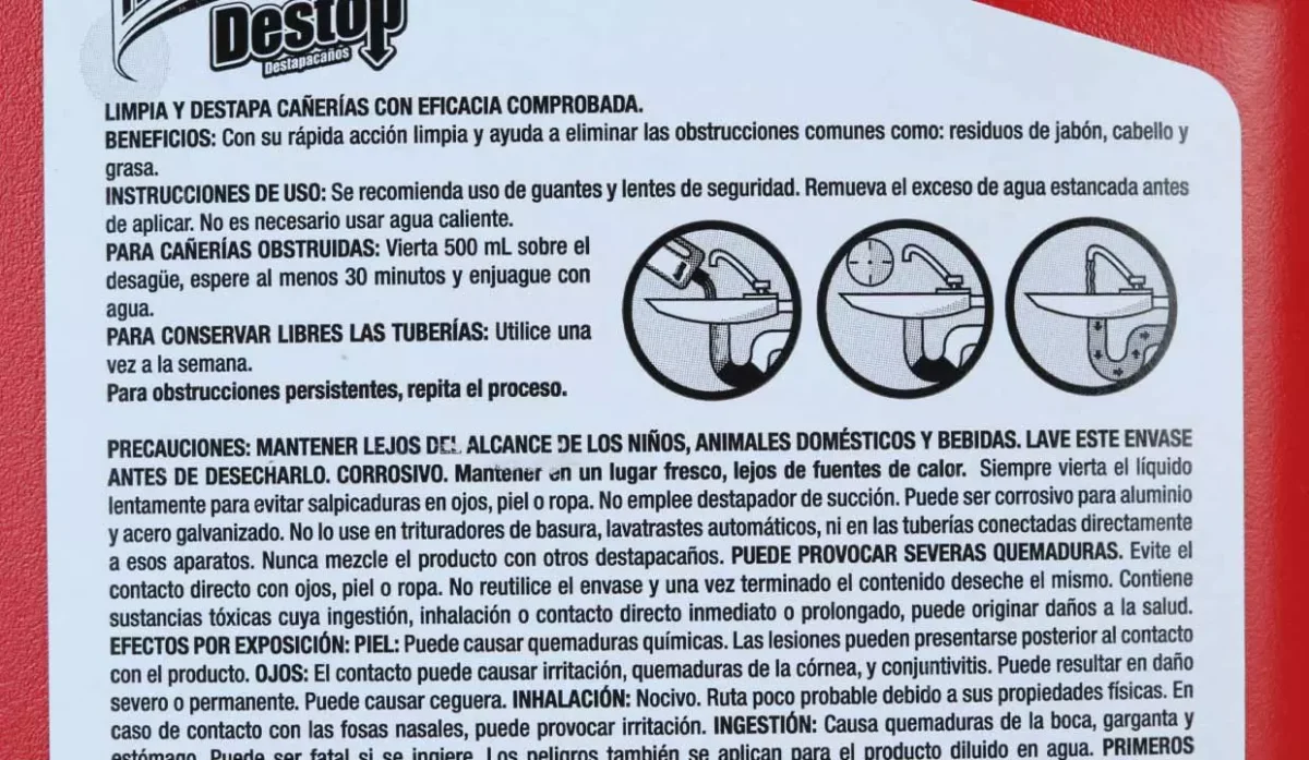 - Vierta 500ml sobre el desagüe, espere al menos 30 minutos y enjuague con agua.