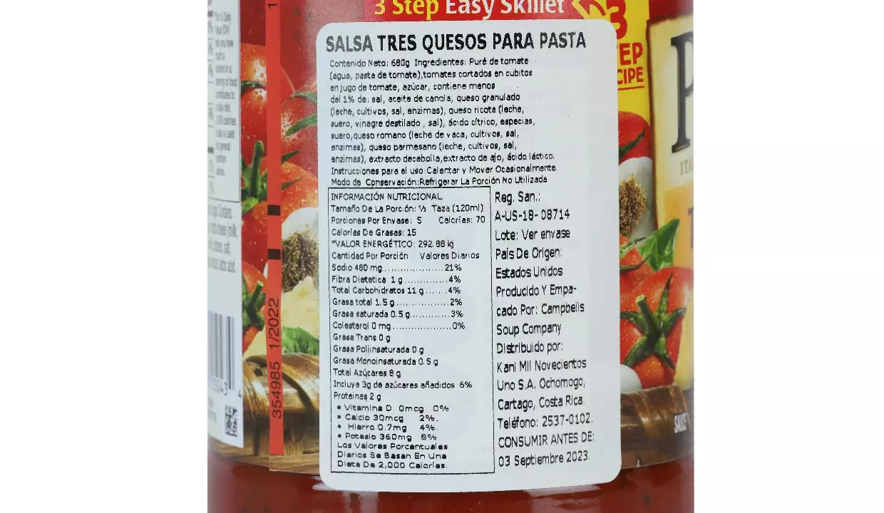 - Puré de tomate, agua, pasta de tomate, tomates cortados en cubitos, azúcar, sal, aceite de canola, queso granulado, queso ricota, ácido cítrico, especias, queso romano, queso parmesano, extracto de cebolla y extracto de ajo.