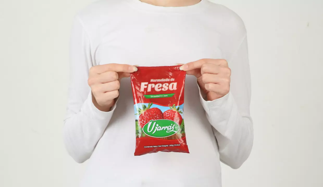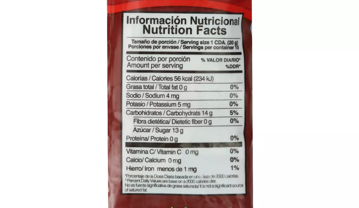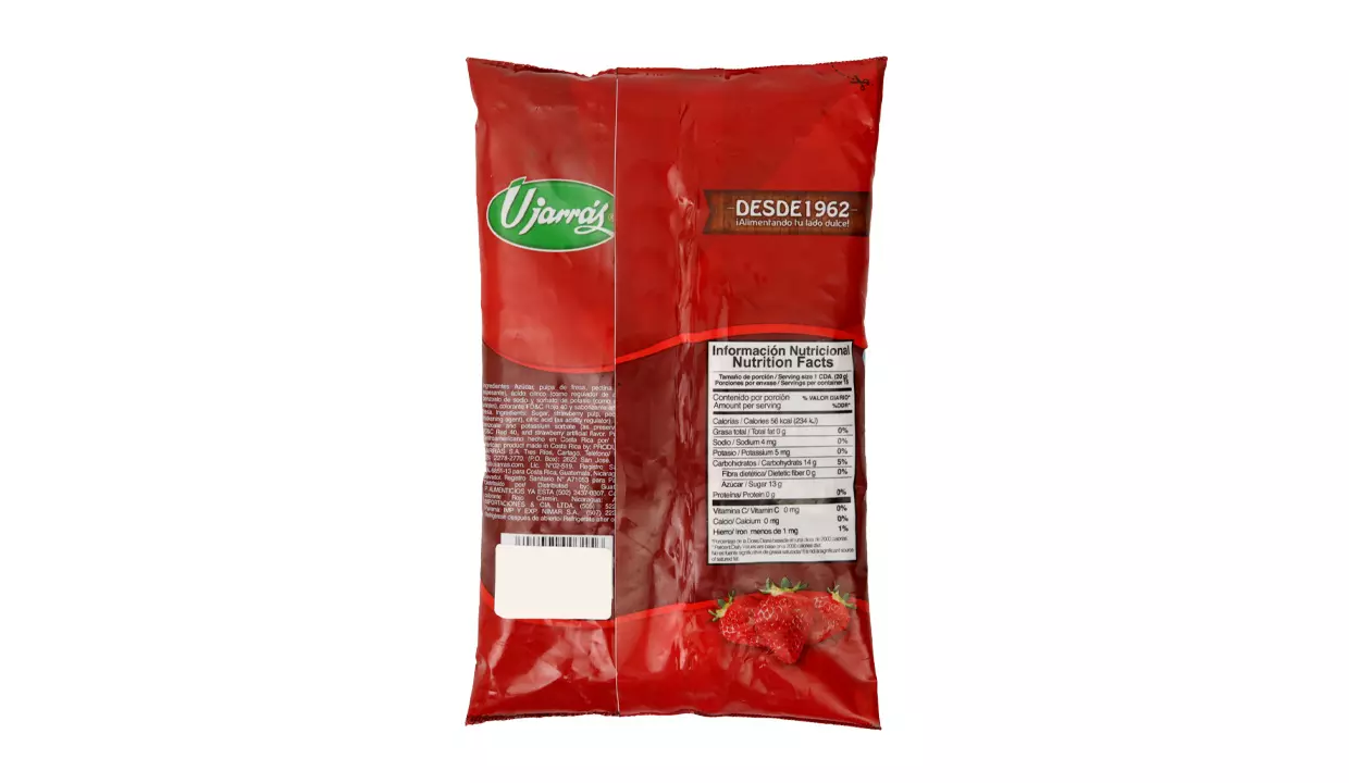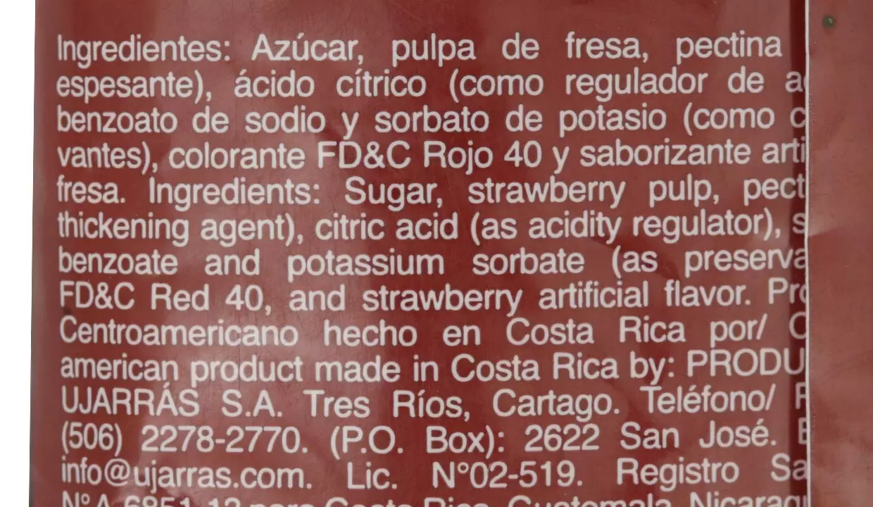 - Azúcar, fresa, pectina (como gelificante), ácido cítrico (como acidulante), benzoato de sodio y sorbato de potasio (como preservantes), colorante FD&C Rojo 40 y saborizante.