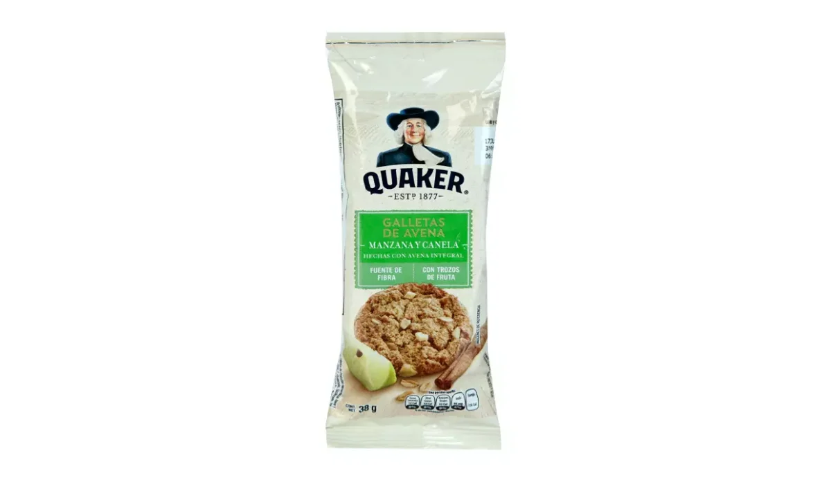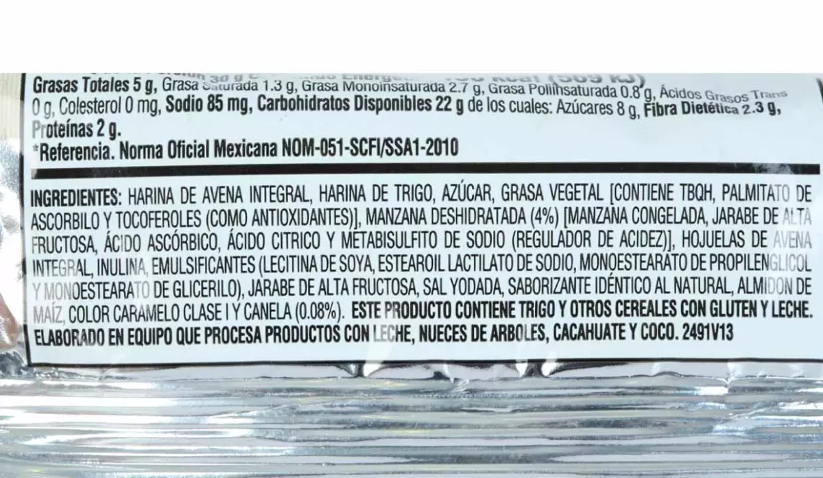 - Harina de avena integral, harina de trigo, azúcar, grasa vegetal, manzana deshidratada, jarabe de alta fructosa, ácido cítrico, hojuelas de avena, almidón de maíz, color caramelo y canela.