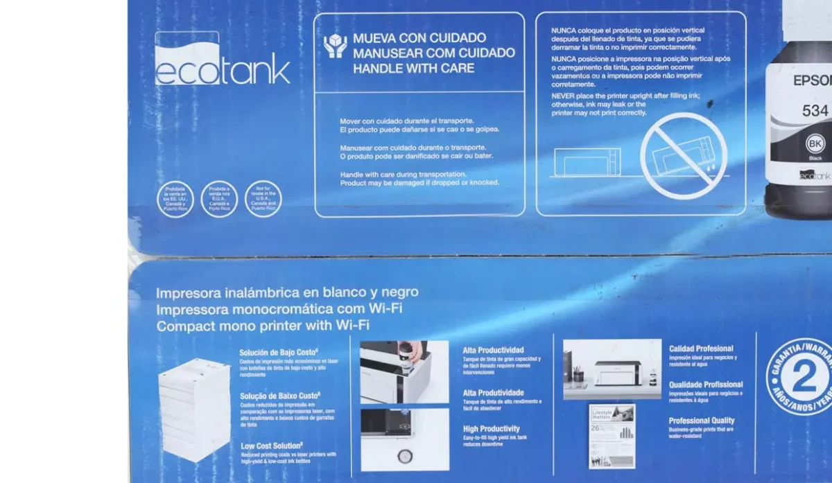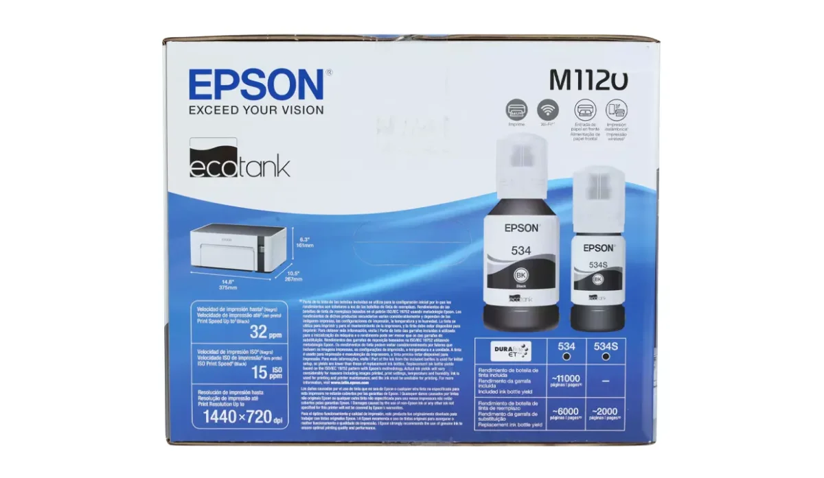 - Rendimiento de botella de tinta de reemplazo: T534: 1 botellas con tinta negra rinde hasta 6.000 páginas / T534S: 1 botellas con tinta negra rinde hasta 2.000 páginas.